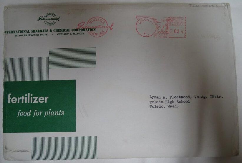 The envelope that International Minerals and Chemical Corporation sent the book "Fertilizer: Food for Plants" (TIN-0063.1) to Lyman A. Fleetwood.