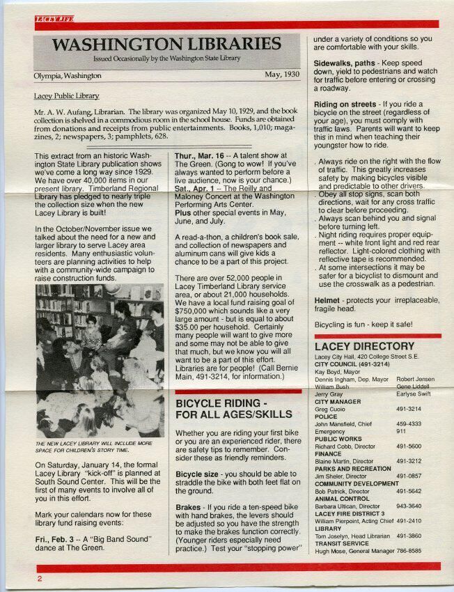 Government Services, Burlington Northern Railroad, Hicks Lake, Lacey Historical Society, Lacey School, Lacey Timberland Library, Lake Lois, Lakes Association, The, Long Lake, Pattison Lake, Washington Centennial '89, Bicycles