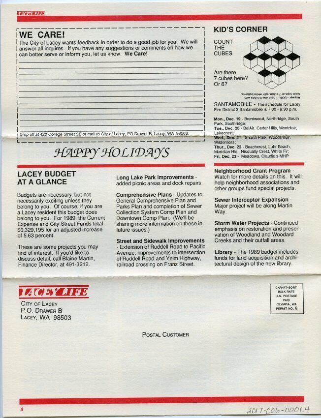 December 1988 issue of the Lacey Life newsletter, a publication of the City of Lacey.