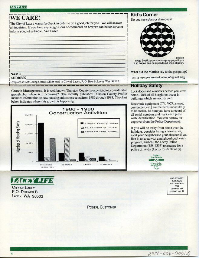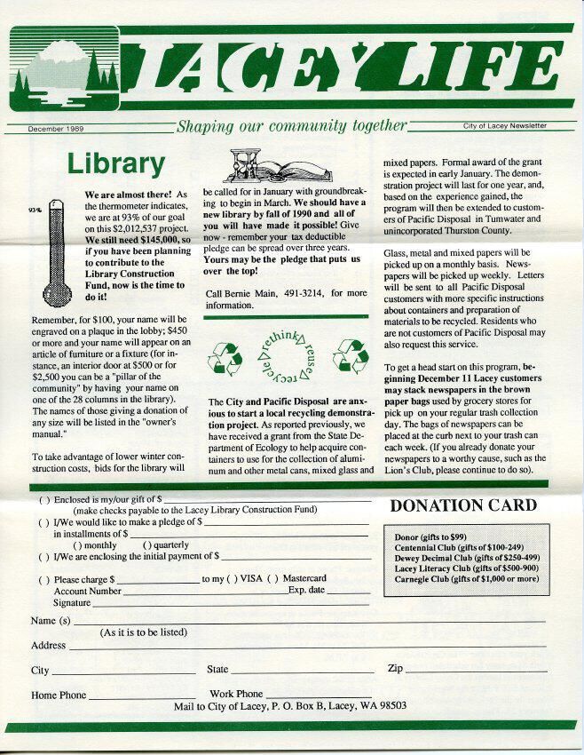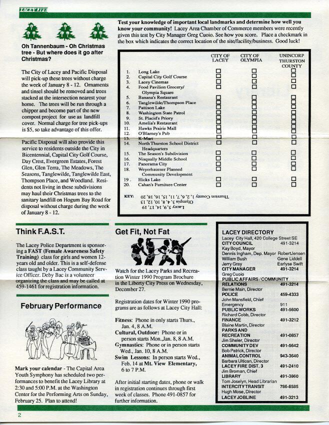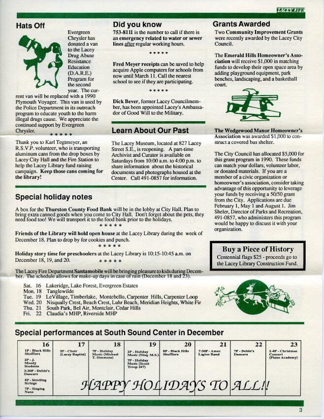Government Services, Capital Area Youth Symphony, The, Community Improvement Grant Program, DARE (Drug Abuse Resistance Education), Emerald Hills Homeowner's Association, Lacey Library, Lacey Museum, Lacey Parks and Recreation, Wedgewood Manor Homeowner's Association, Christmas