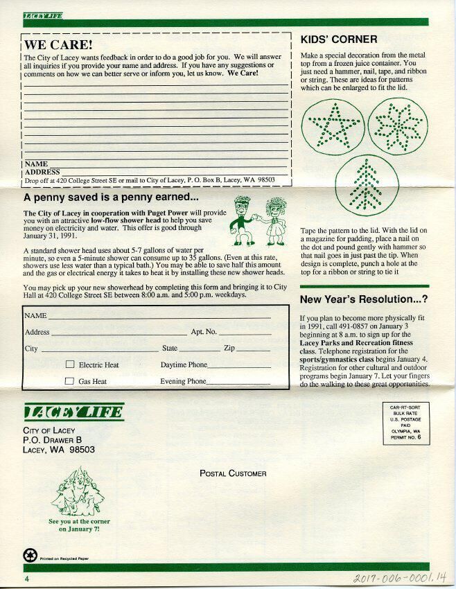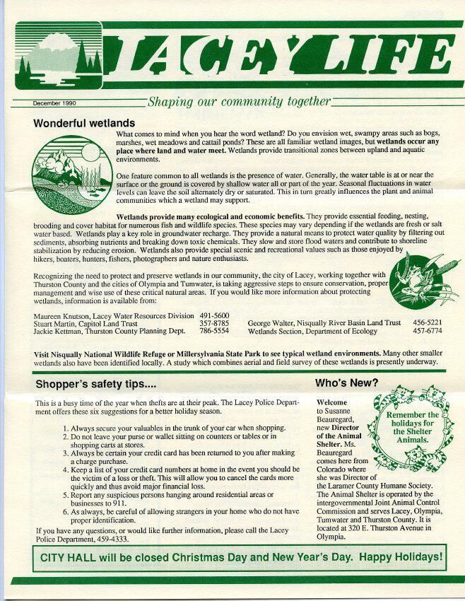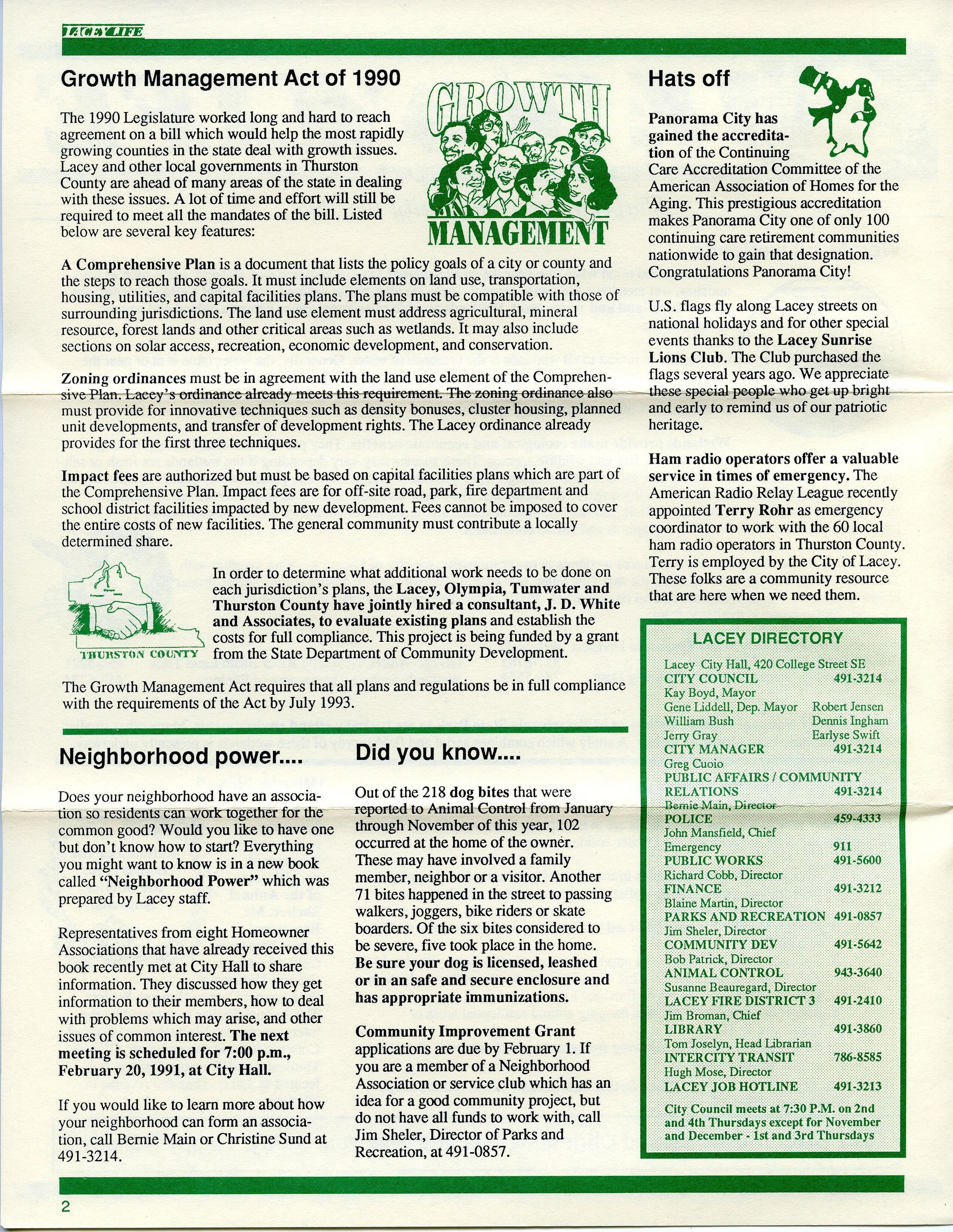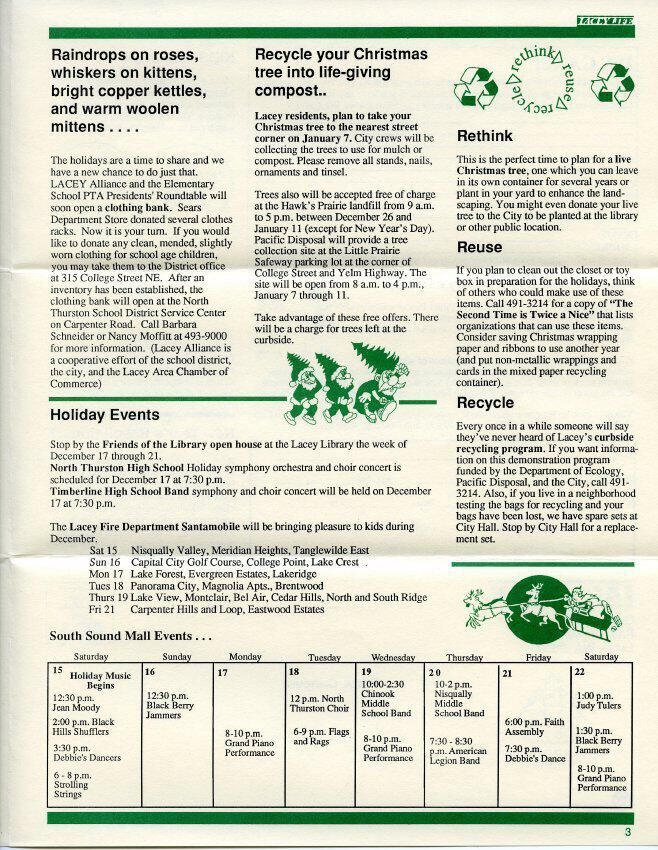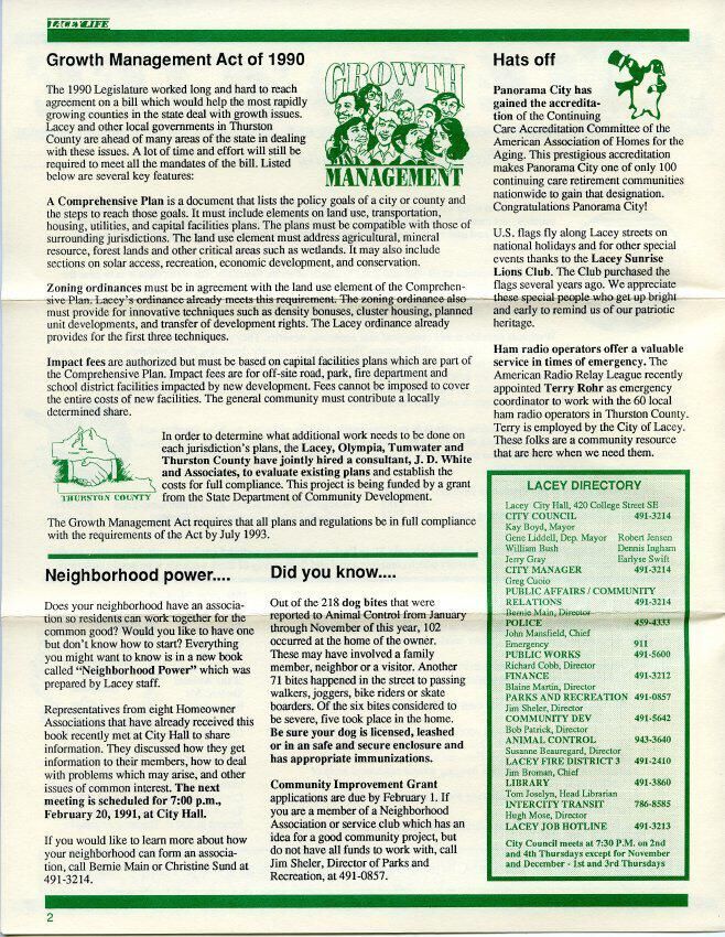 Government Services, Growth Management Act of 1990, Panorama City, Lacey Sunrise Lions Club, Pacific Disposal, North Thurston High School, Timberline High School, Lacey Fire Department, Santamobile, Puget Power, Lacey Alliance, Lacey Parks and Recreation, Lacey Alliance for Children, Education and Youth (LACEY)