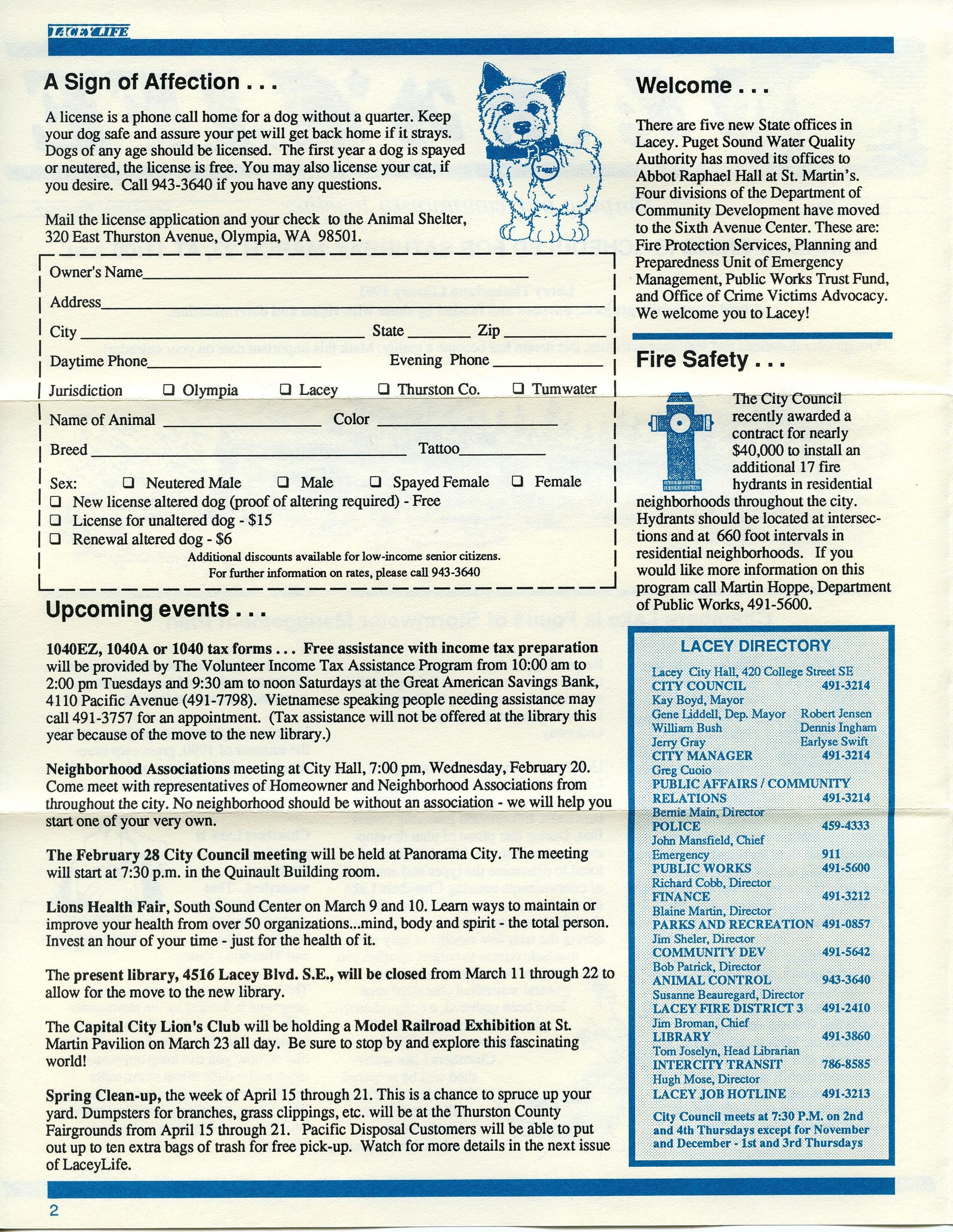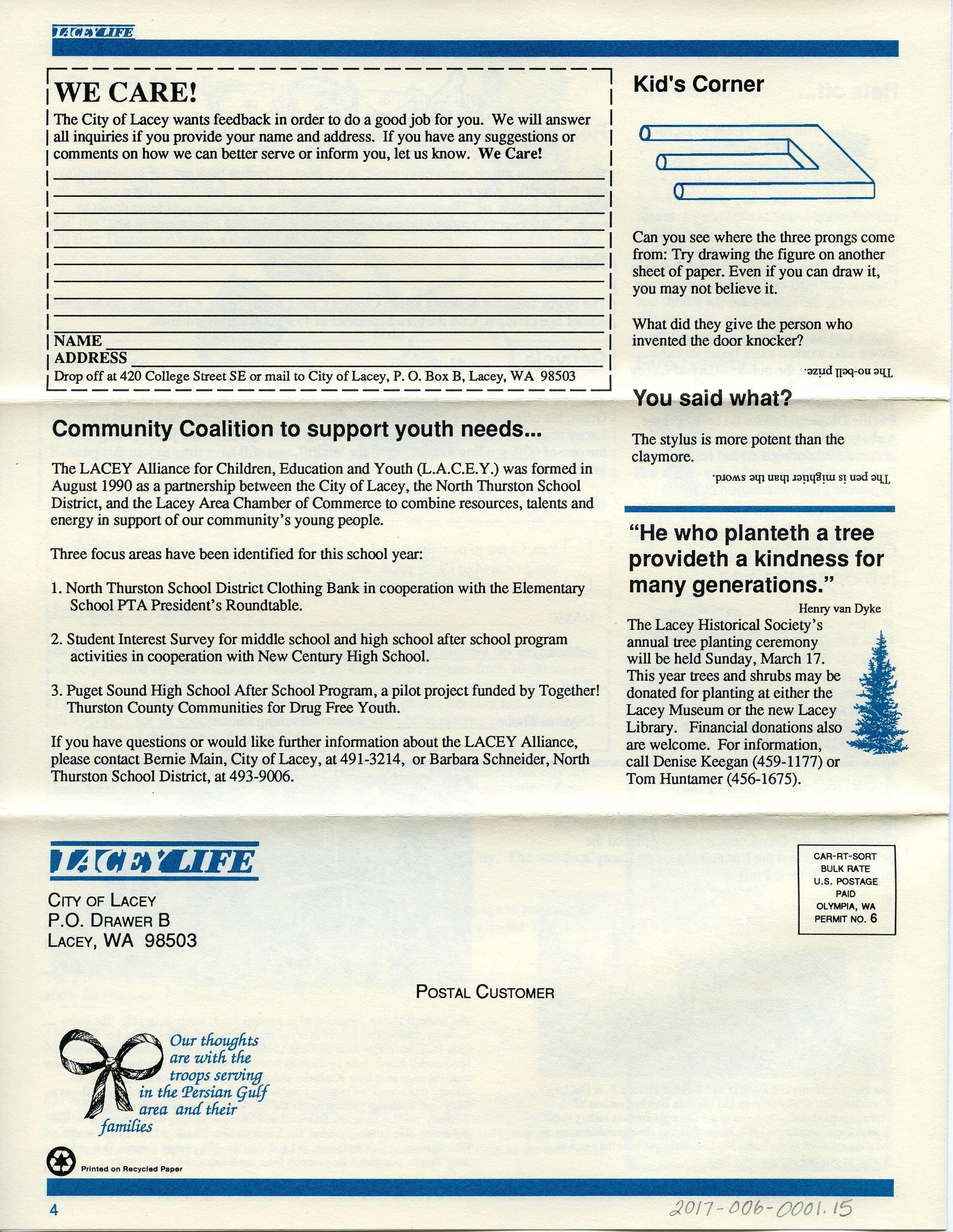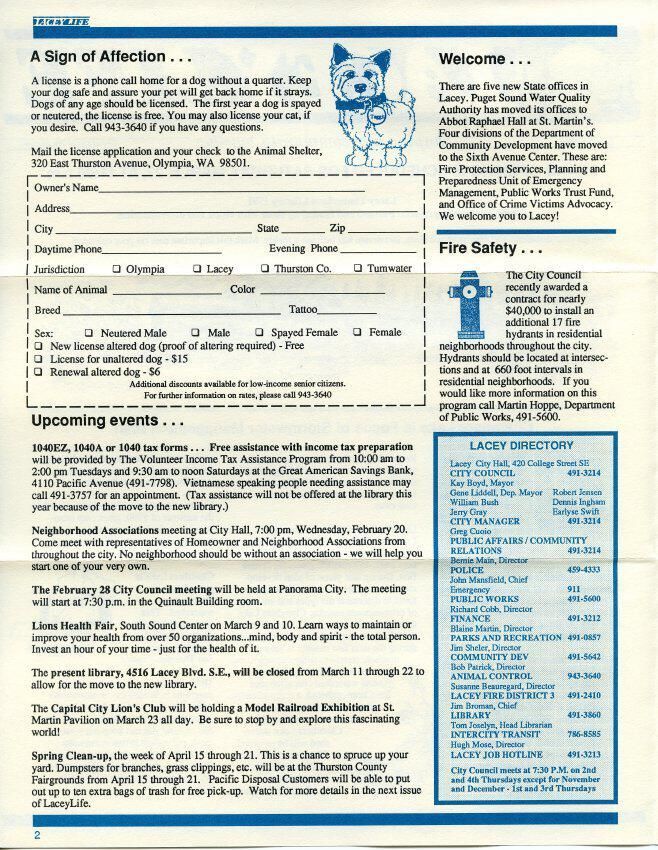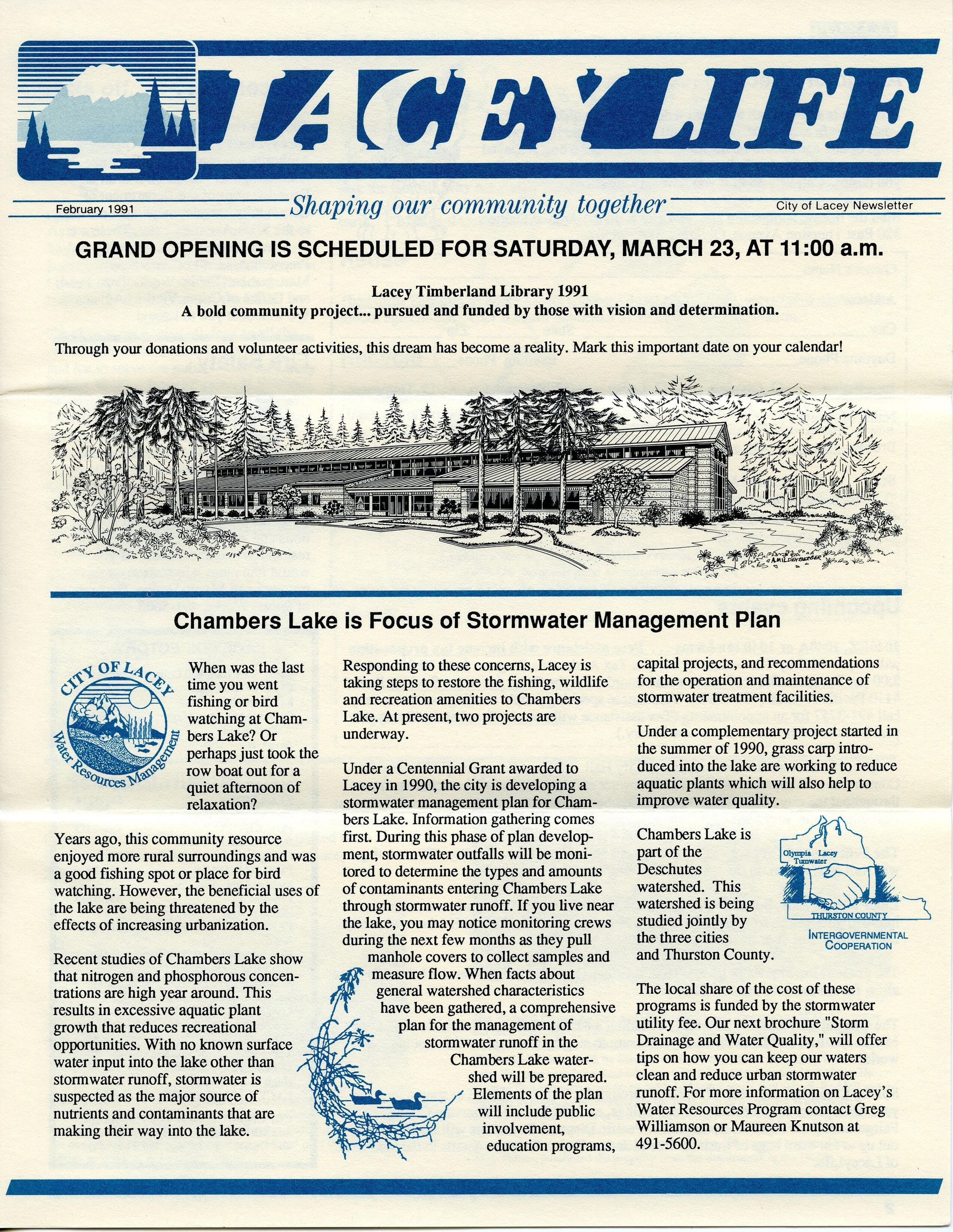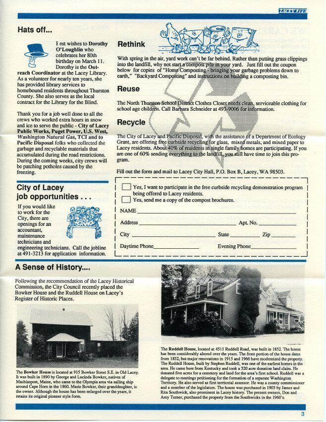 Government Services, Bowker House, Capital City Lions Club, Chambers Lake, Lacey Alliance for Children, Education and Youth (LACEY), Lacey Historical Society, Lacey Library, Lacey Register of Historic Places, New Century High School, Pacific Disposal, Puget Sound High School, Puget Sound Water Quality Authority, Southwick-Ruddell House, Together!, Washington State Department of Community Development