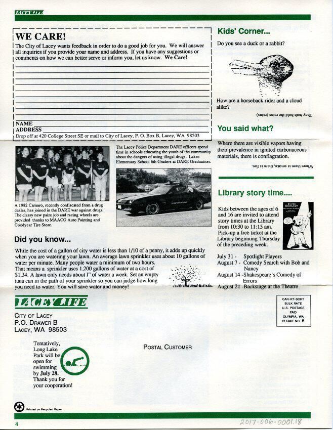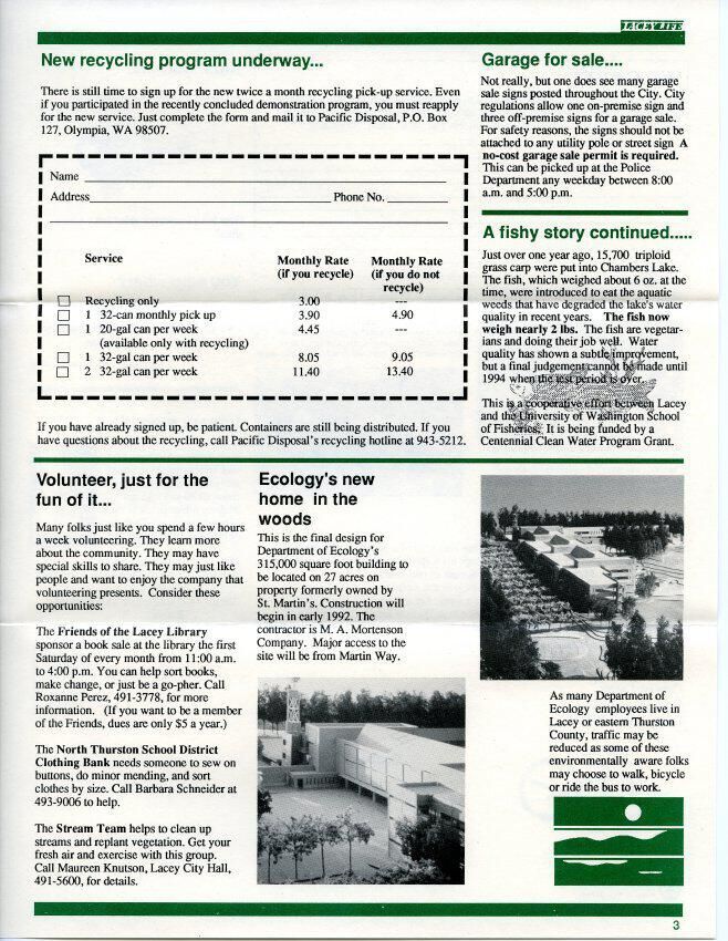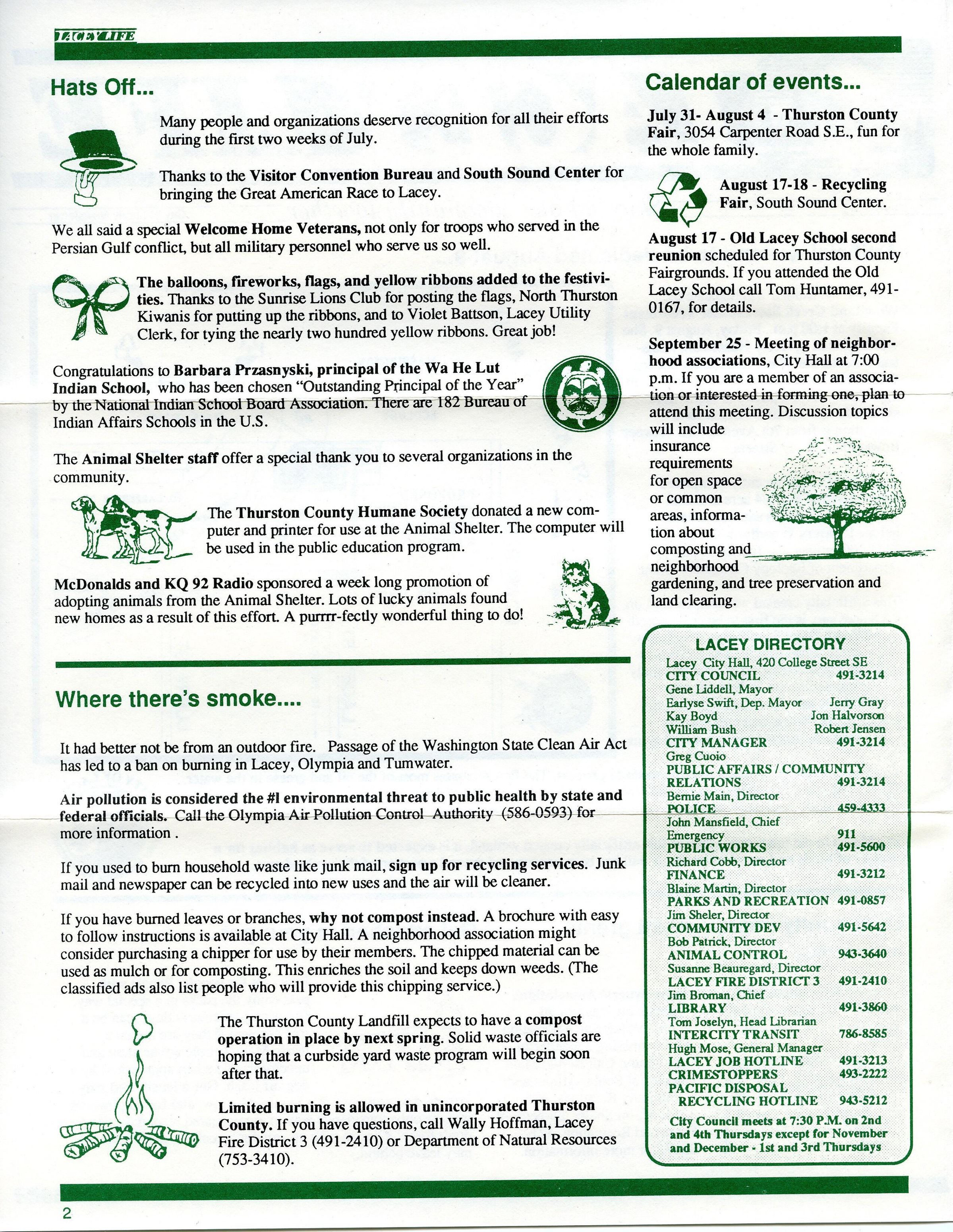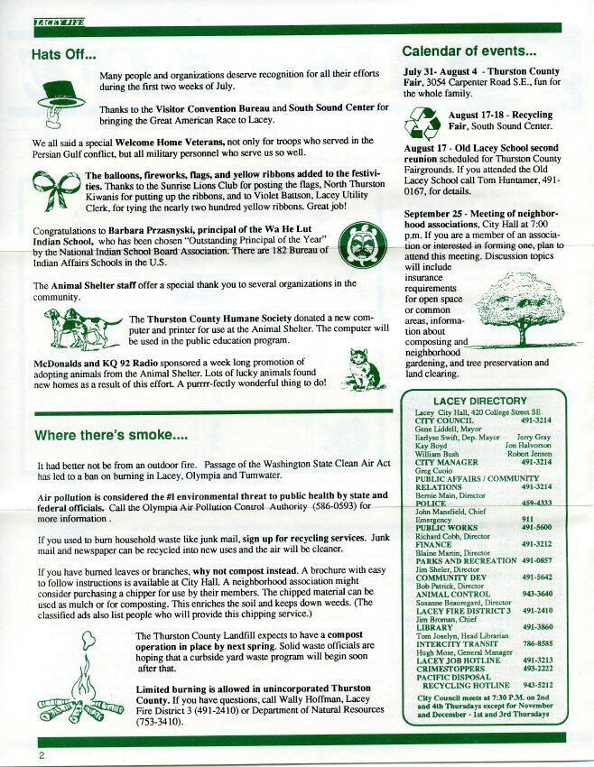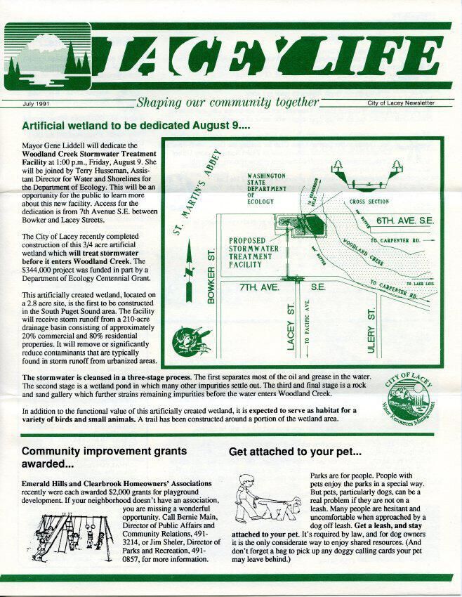 Government Services, Woodland Creek, Woodland Creek Stormwater Treatment Facility, Washington State Department of Ecology, Emerald Hills Homeowner's Association, Clearbrook Homeowners' Association, South Sound Shopping Center, Sunrise Lion's Club, North Thurston Kiwanis, Thurston County Humane Society, McDonald's, Washington State Clean Air Act, Thurston County Fair, North Thurston Clothing Bank, Stream Team, Chambers Lake, DARE (Drug Abuse Resistance Education), Lakes Elementary School, Stormwater, Volunteers