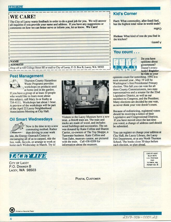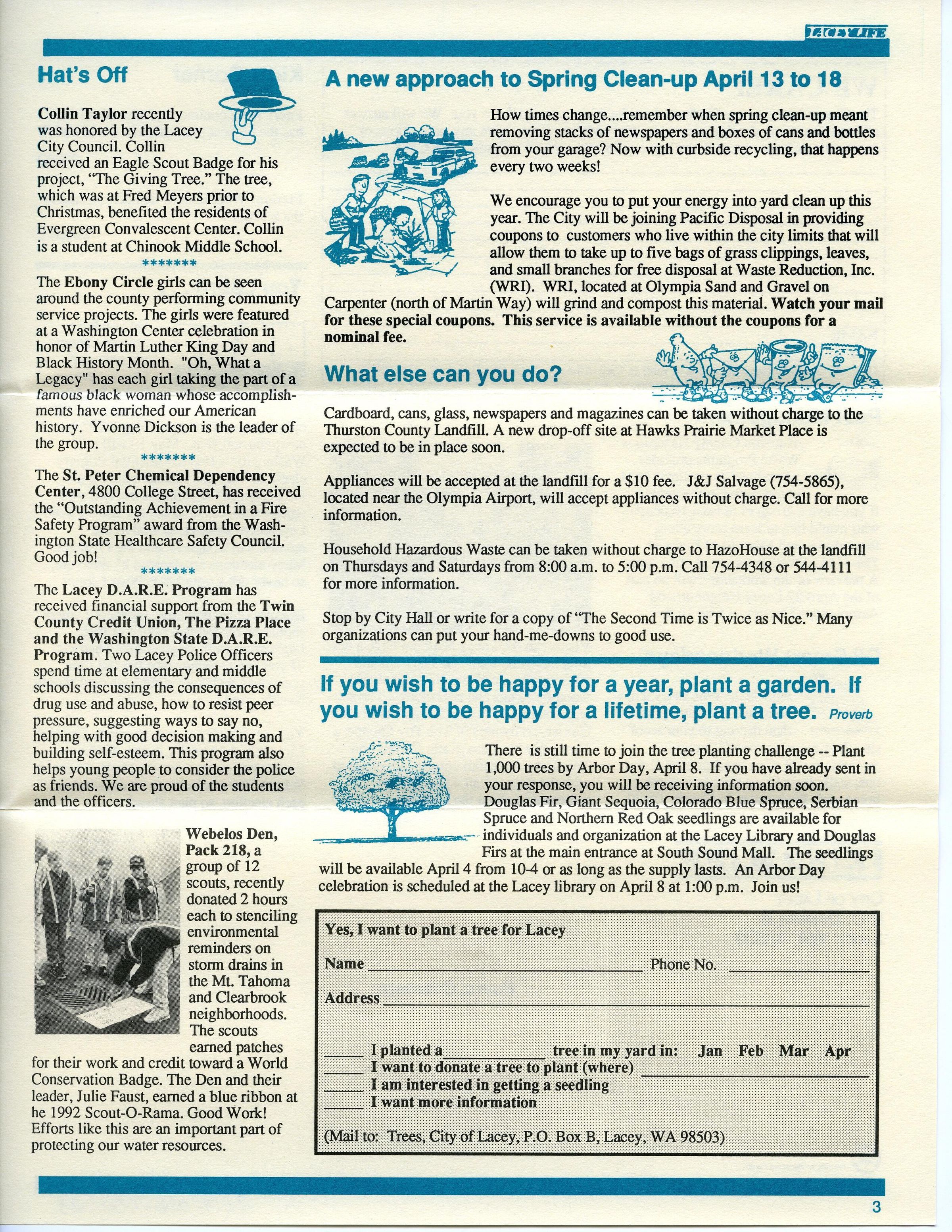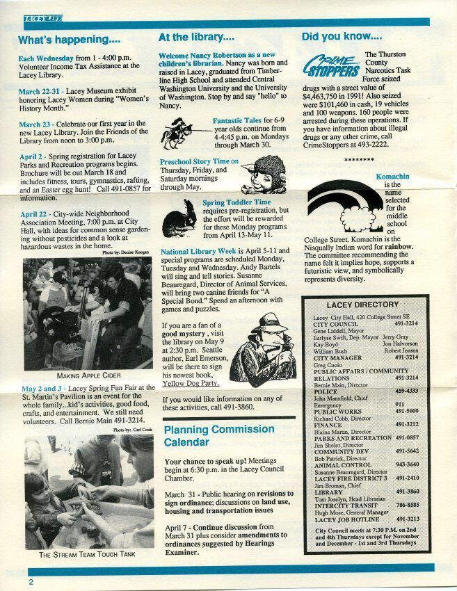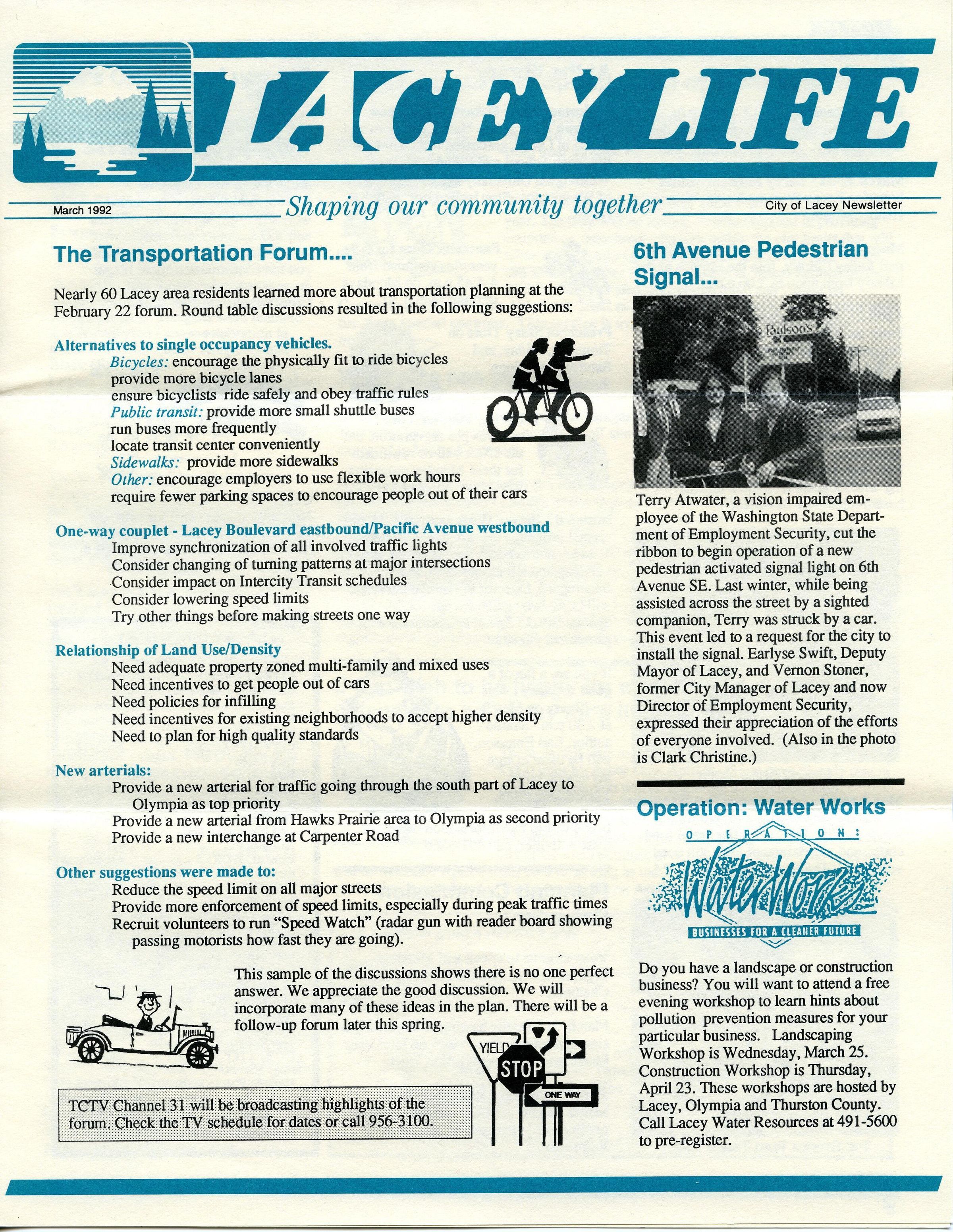 March 1992 issue of the Lacey Life newsletter, a publication of the City of Lacey.
