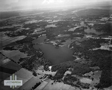 Digital image is a black and white aerial photograph of Lacey looking north, with Pattison Lake in the foreground and Hicks Lake and Long Lake in the background.