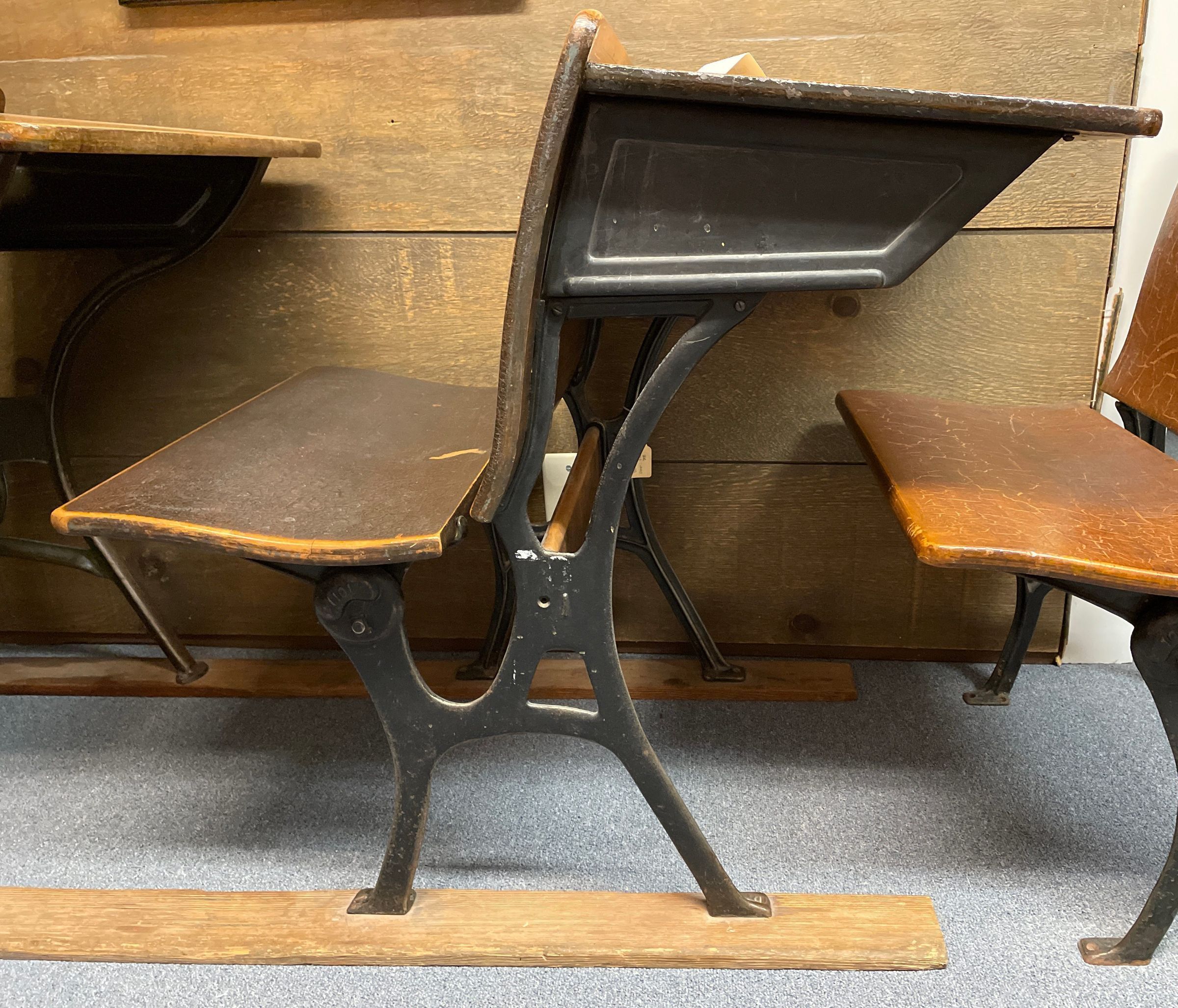 Old wooden school desks. Purchased by donor from Carol Nichols who used them as study desks for her children. Original owner unknown.