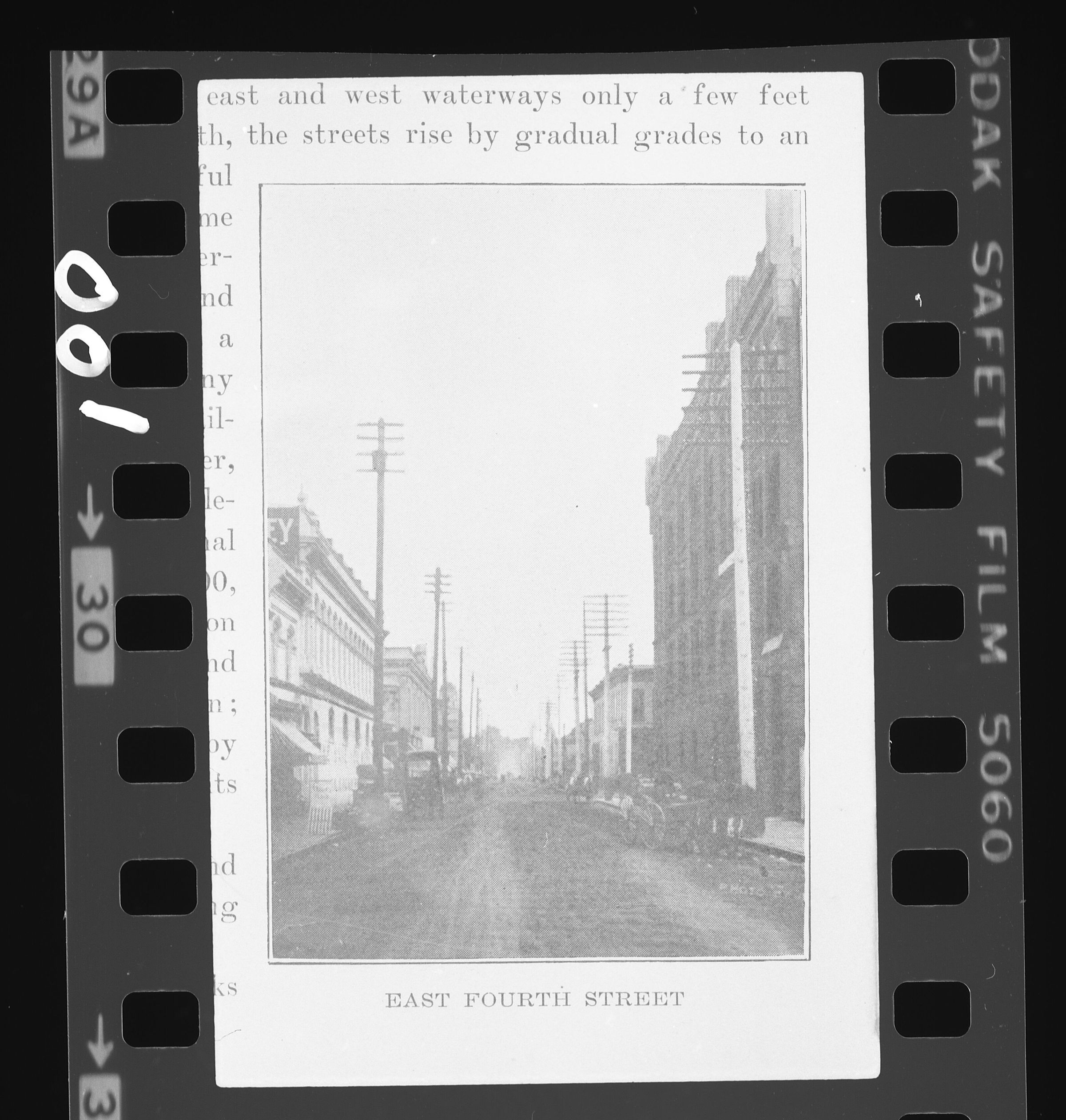 Negative is frame #30 on a strip of four. Image includes a title below, "East Fourth Street" and a thin line frame aroud it. Words from the book page can be seen around the outside frame of the image. Image is poor quality since it came from a book. Printed on the top edge of the negative is: KODAK SAFETY FILM 5060. The frame number is printed at the bottom. "001" is written directly on the bottom of the negative.