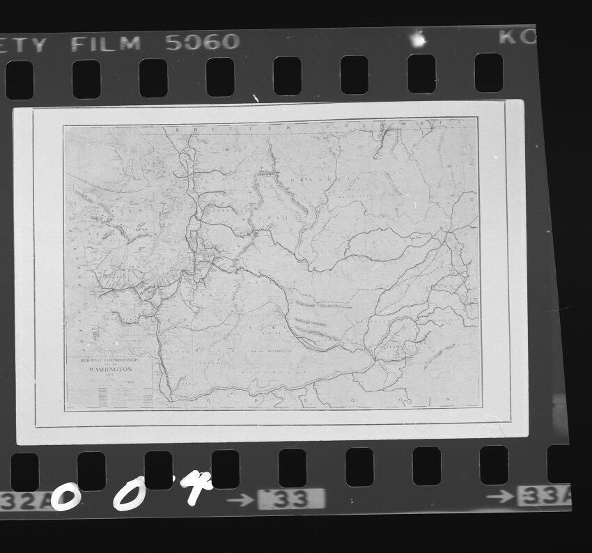 Washington state Railroad Commissioner's map from the turn of the century. Black and white 35mm negative created from the inside cover of "Olympia," a circa 1907 Olympia Chamber of Commerce promotional brochure or booklet.
