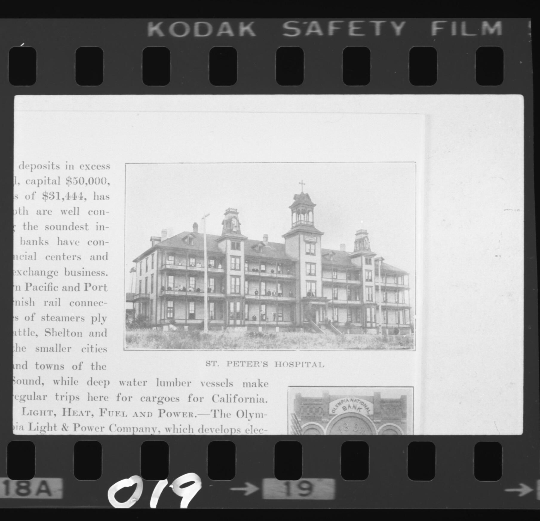 Negative is frame #19, fifth on a strip of five. Image includes a title below, "St. Peter's Hospital" and a thin line frame is around the image. This is a photo of the old St. Peter's Hospital. Partial image is present below the title and partial text appears below and to the left of the image. Image is poor quality since it came from a book. The frame number "19" is printed at the bottom and "019" is written directly on the bottom of the negative.