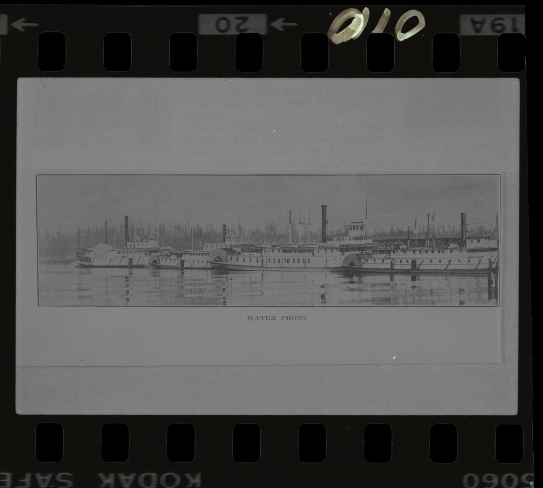 Panoramic view of Olympia's Water Front along the downtown waterfront at the turn of the 20th century. Black and white negative created from a slide of Page 8 of "Water Front," a circa 1907 Olympia Chamber of Commerce promotional brochure or booklet.