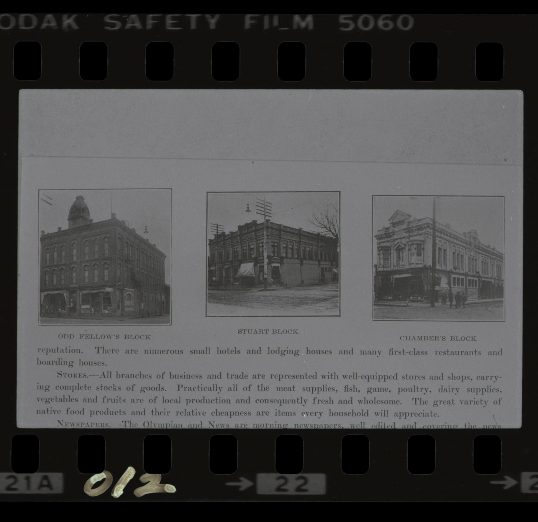 Negative is frame #22, third on a strip of five. Image includes a title below, "Odd Fellows Block", "Stuart Block", & "Chambers Block". Thin lines are around each image. Photo shows buildings in downtown Olympia at turn of the century. Text present to the bottom of image. Image is poor quality since it came from a book. The frame number "22" is printed at the bottom and "012" is written directly on the bottom of the negative.
