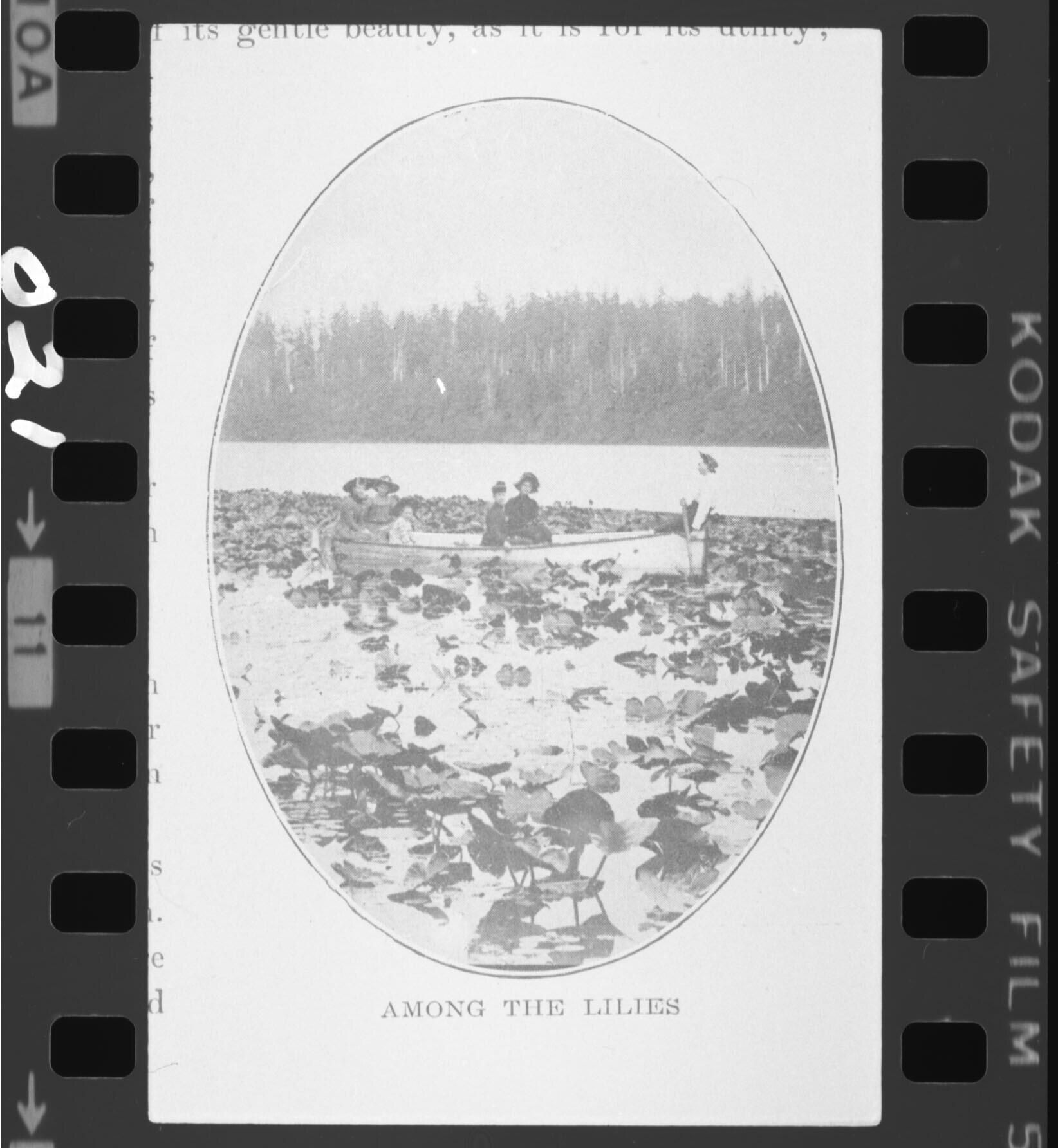 Negative is frame #11, second on a strip of five. Image includes a title below, "Among the Lilies". Thin circular line around the image. Photo shows a man, four women, and a child in a row boat, (probably on lake), near Olympia at turn of the century. Image is poor quality since it came from a book. The frame number "11" is printed at the left side and "021" is written directly on the left side of the negative.