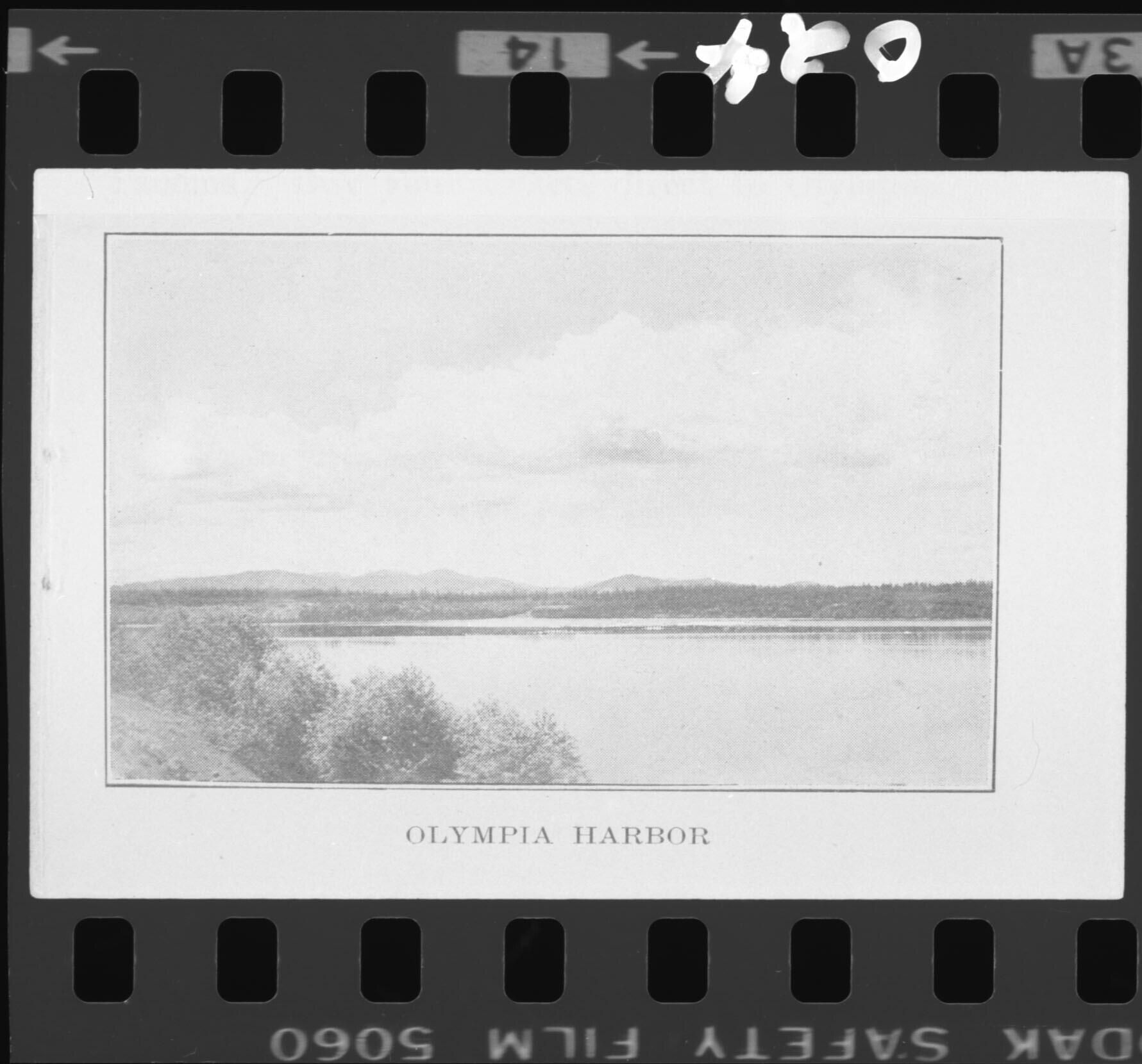 Olympia Harbor. Black and white negative created from a slide of Page 9 of "Olympia," a circa 1907 Olympia Chamber of Commerce promotional brochure or booklet.