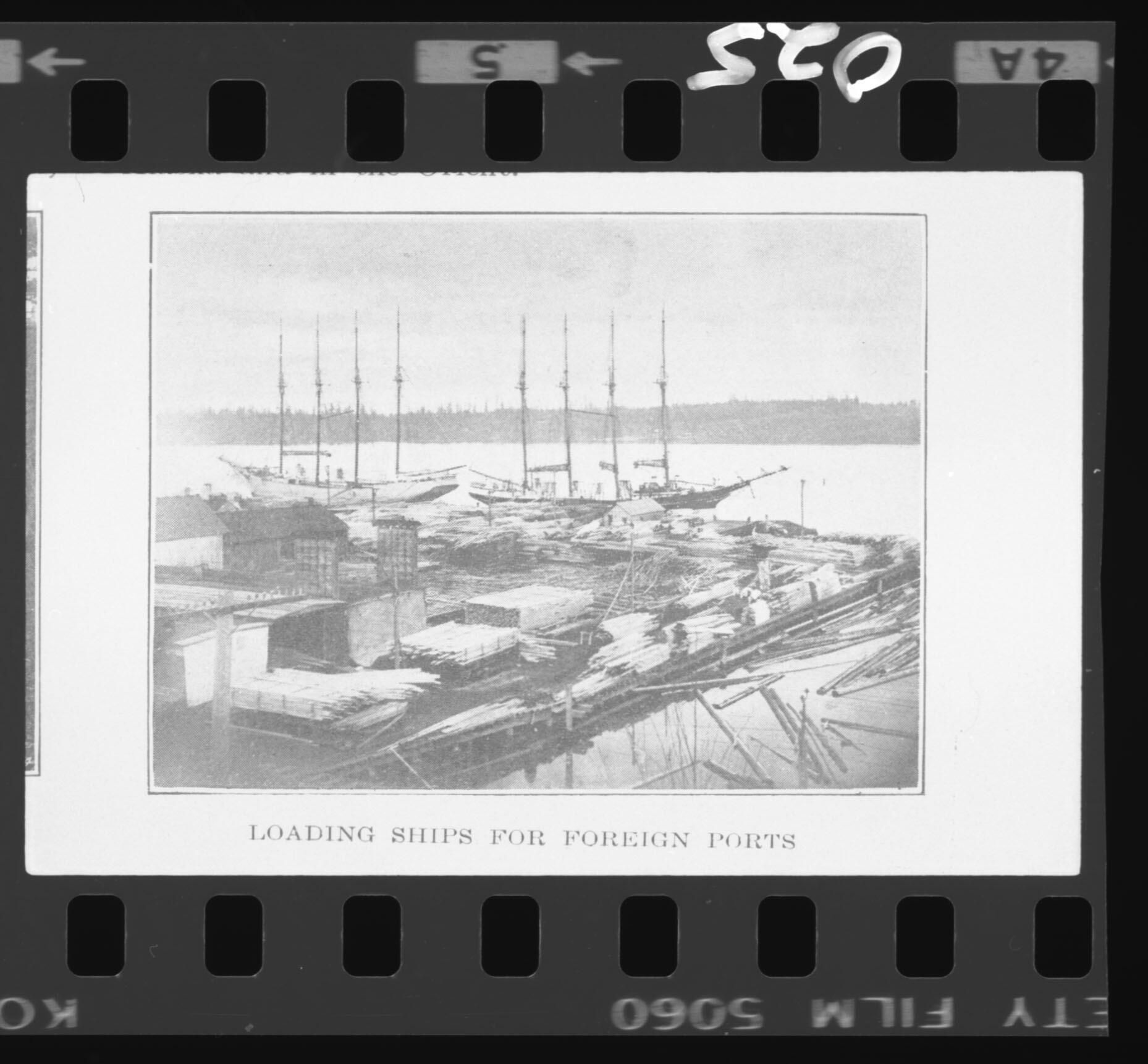 Negative is frame #5, first on a strip of five. Image includes a title below, "Loading Ships For Foreign Ports". Thin line around the image. Photo shows the Olympia Port and ships being loaded at turn of the century. Image is poor quality since it came from a book. The frame number "5" is printed at the top side and "025" is written directly on the top of the negative.