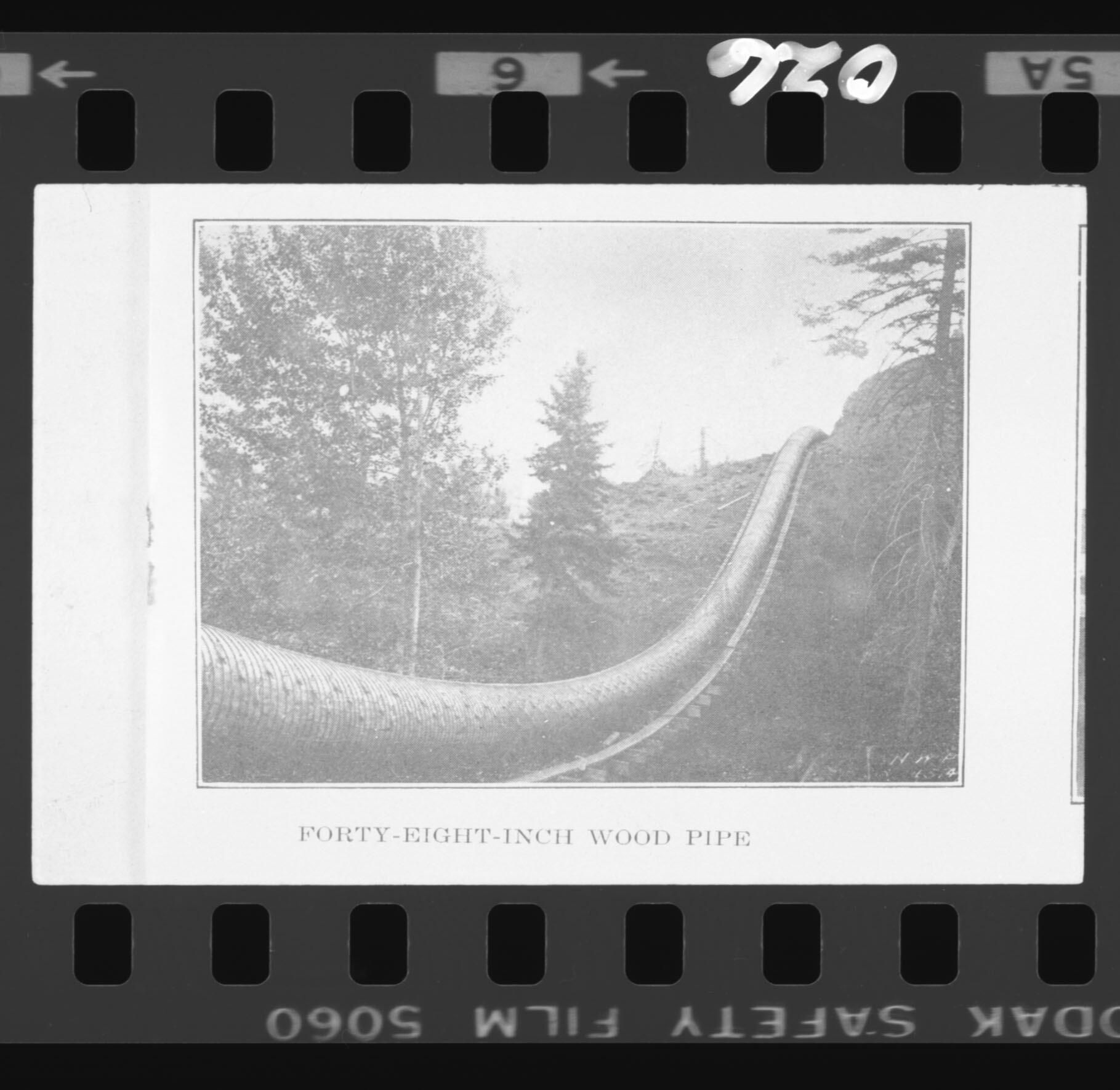Negative is frame #6, second on a strip of five. Image includes a title below, "Forty-Eight Inch Wood Pipe". Thin line around the image. Photo shows a forty-eight inch wood pipe that was seemingly used for transporting logs at turn of the century. Image is poor quality since it came from a book. The frame number "6" is printed at the top side and "026" is written directly on the top of the negative.