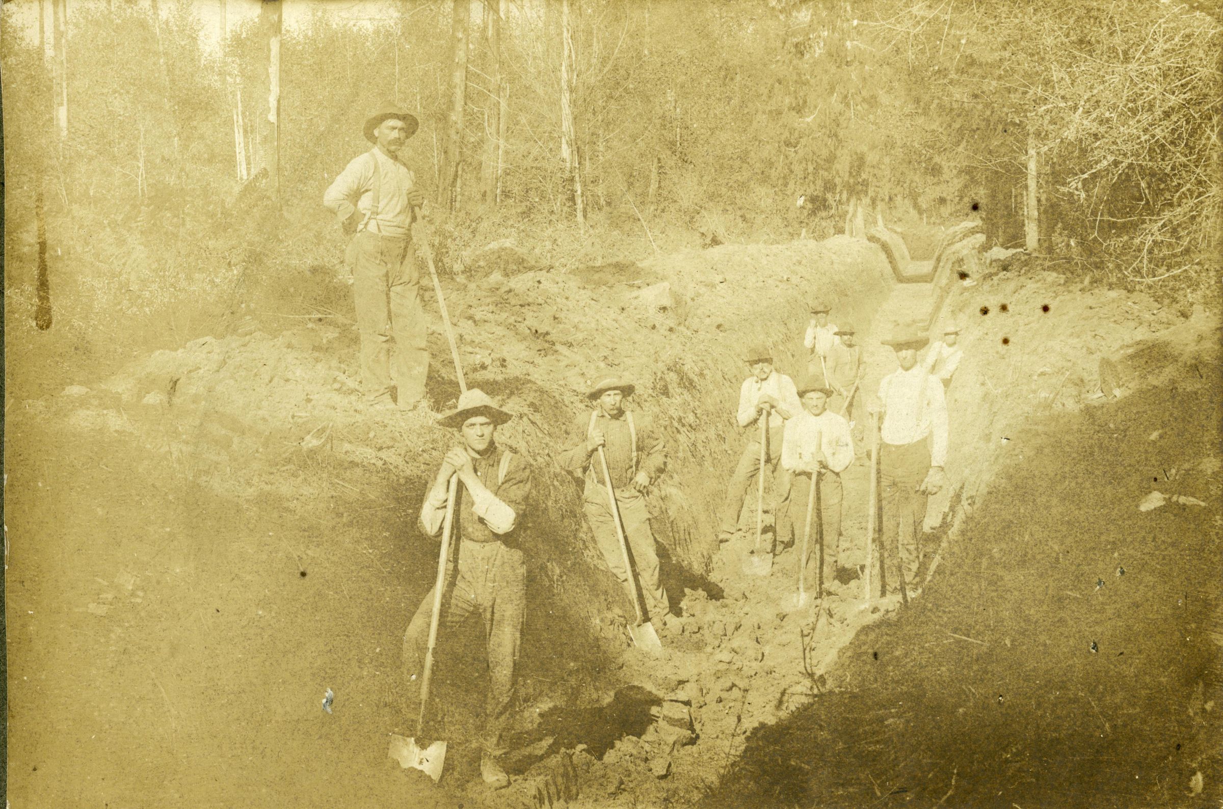Photograph of a crew hand-digging the drainage ditch from Chambers Lake to the Deschutes River, c. 1916. Original print is warm-toned and very faded into yellows. The 4 1/8" x 6 1/4" hand-cut print is mounted onto a 6 1/2" x 8 1/2" gray card. The image depicts a crew of nine men, one of which is standing on the left bank of the ditch and the remainder are in the ditch. All are holding shovels and wearing button-down shirts, pants, suspenders and wide-brimmed hats.Made/Created