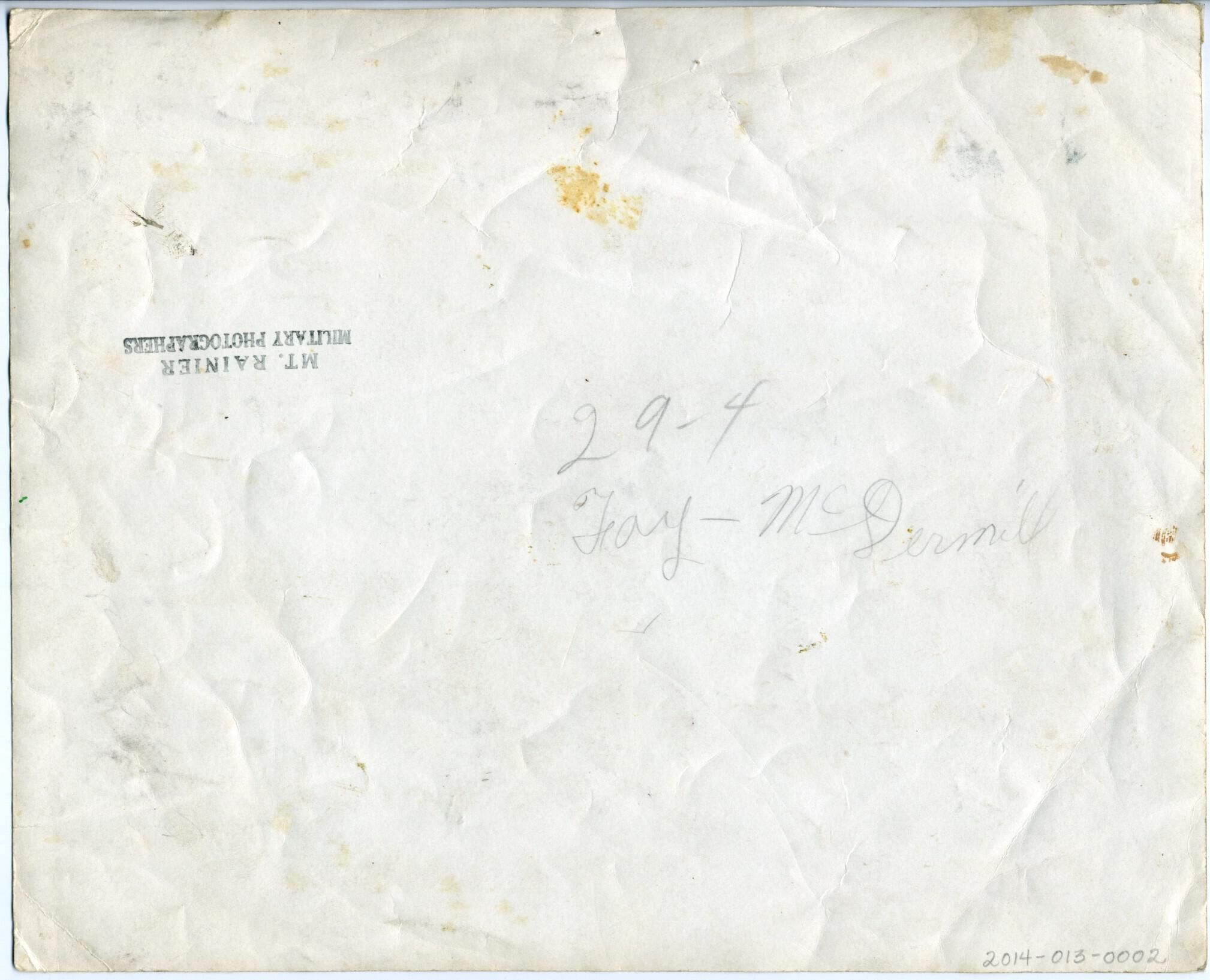 On the back of the photograph is stamped in black ink: "Mt. Rainier Military Photographers" and written in pencil: "29-4 Fay - McDermitt".Made/Created