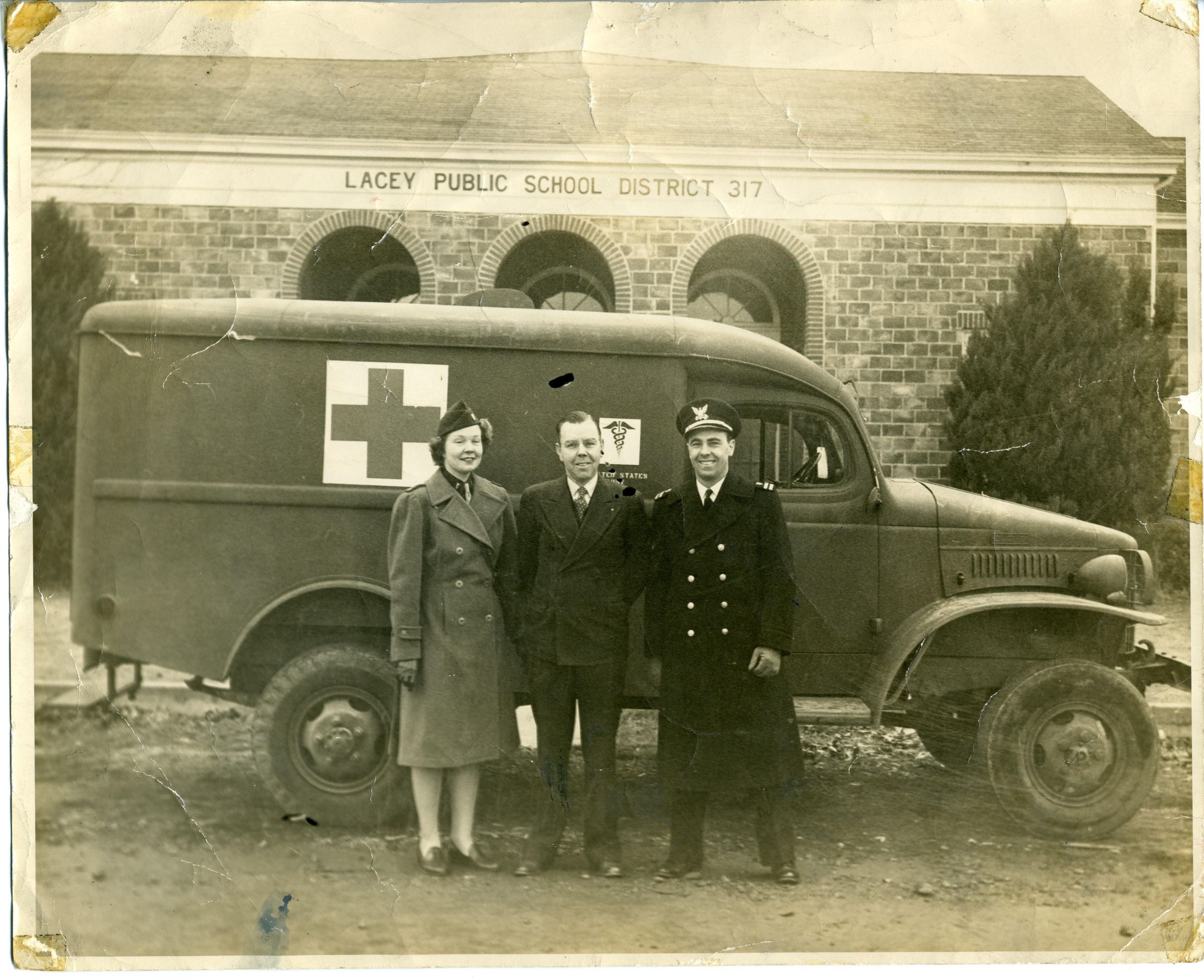 Fay McDermitt, Ted McArthur and 1943 penny drive ambulance. Black and white 8 x 10 photograph is taken in front of the Lacey School building that was on Carpenter & Pacific. Pictured is the ambulance purchased by the Lacey school children as a result of their penny drive fundraiser. Three people stand in front of the ambulance. Ted McArthur, principal of Lacey School is in the center. On either side of him are military personnel, presumably accepting the gift. On the left is Fay McDermitt (a presumption based on the id on the back of the photograph) and the man on the right is unidentified. Across the top of the building it reads: "Lacey Public School District 317".
