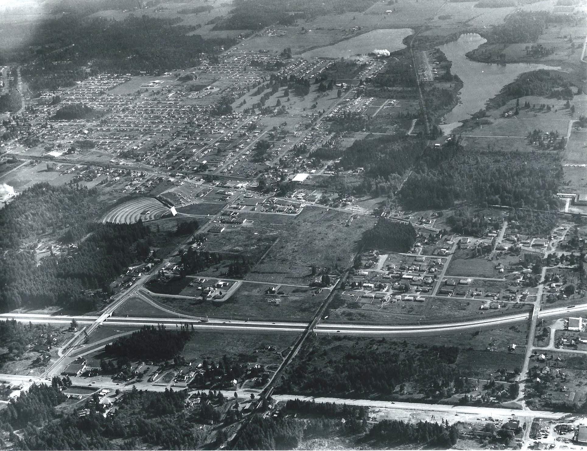 Four Lacey aerial photograph jpeg files, 1960 and 1964. A digital folder titled "Lacey Old Pics" containing four low-resolution images (scans, probably of photographs). Digital images depict such sights as the Lacey Drive-In, the racetrack, St. Martin's and the future site of South Sound Center. One is a close-up of the Lacey Drive-In. Images were scanned at 200 dpi by the donor's father and we were unable to get them re-scanned.