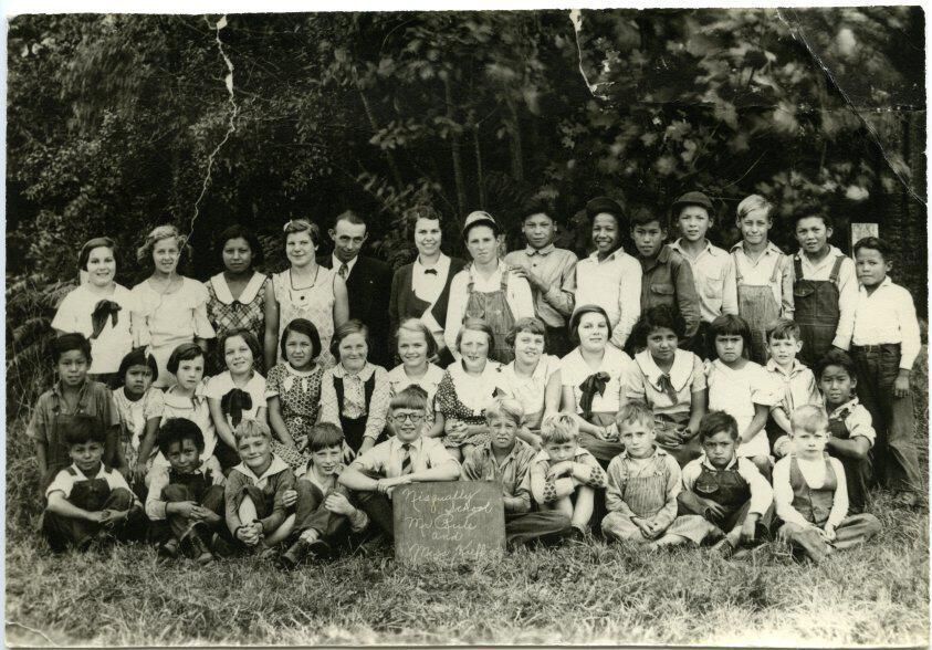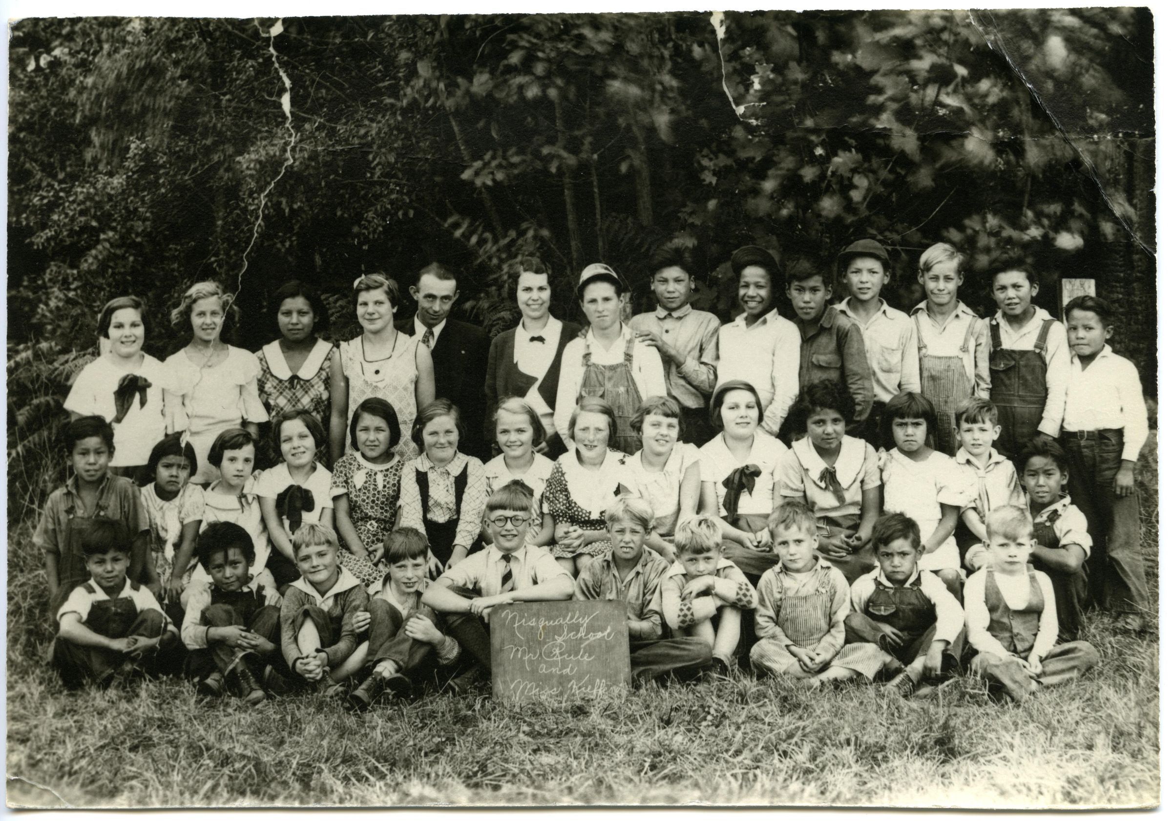 Nisqually School class photo, c. 1930s. Black and white 5 x 7 matte photograph is a class photo featuring 23 boys and 15 girls; they are a mix of white and Native American children. There are two teachers in the back row center, Mr. Rule and Miss Kieffer. At the center front row, there is a chalk board being held up by two boys which reads "Nisqually School Mr. Rule and Miss Kieffer." There is nothing on the reverse of the photo. There are several creases, especially at the top with some surface loss. Date unknown and no students are identified.Made/Created