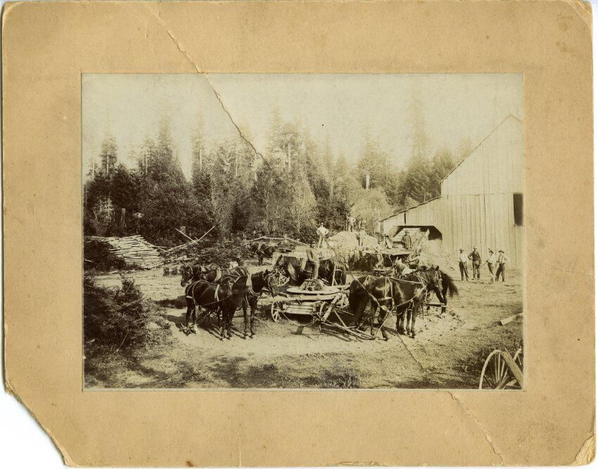 W. W. Fleetwood's thrashing machine and crew. Black and white 4 1/2" x 6 1/2" print is mounted on tan cardboard, which is very dirty and missing lower left corner. Large diagonal crack from left top to right bottom. Image features five teams of two horses hitched to a wooden thrashing (threshing) machine in the center. There is one man with a large mustache standing on top of the thrashing machine. Behind this, there is a wagon with a team of two horses hitched to it and two men in the wagon bed, one standing and one sitting/crouching. Behind the wagon is a very large pile of hay, on top of which are three men holding large poles (or possibly pitchforks). There are four men standing in front of the hay pile and to the right of that are two men standing on another piece of agricultural equipment. The one on the right is holding what might be some type of pipe. There is a large wooden barn on the right side of the photograph and in front of that are four men, one of which has a large bushy beard. All the men are wearing hats, long pants and long-sleeved shirts. There is an array of pine trees in the background. At the left in the background is a large pile of wood logs.