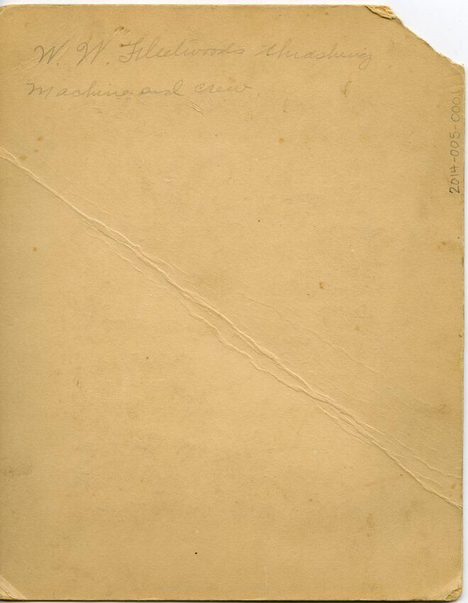 On the reverse of the card is written in pencil on a short end: "W. W. Fleetwoods thrashing machine and crew". Diagonal crack can be seen from the back.Made/Created