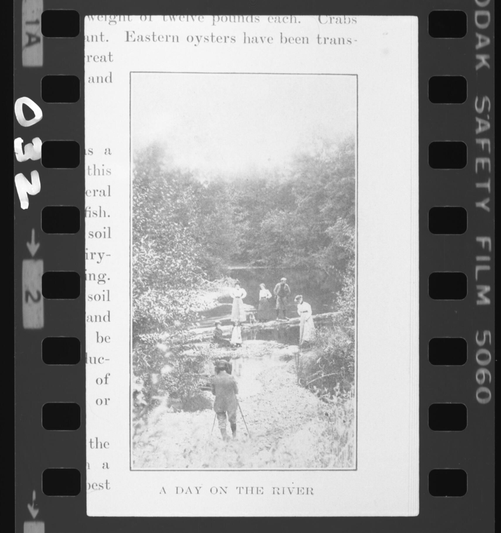 Negative is frame #2, third on a strip of five. Image includes a title below, "A Day on the River" and a thin line frame around it. There is text above and to the left of the image, although it was cropped so the text can't be fully read. Image is poor quality since it came from a book. From the viewer's point of view, the frame number "2" is printed at the left and printed at right is "[KO]DAK SAFETY FILM 5060". "032" is written directly on the left of the negative.