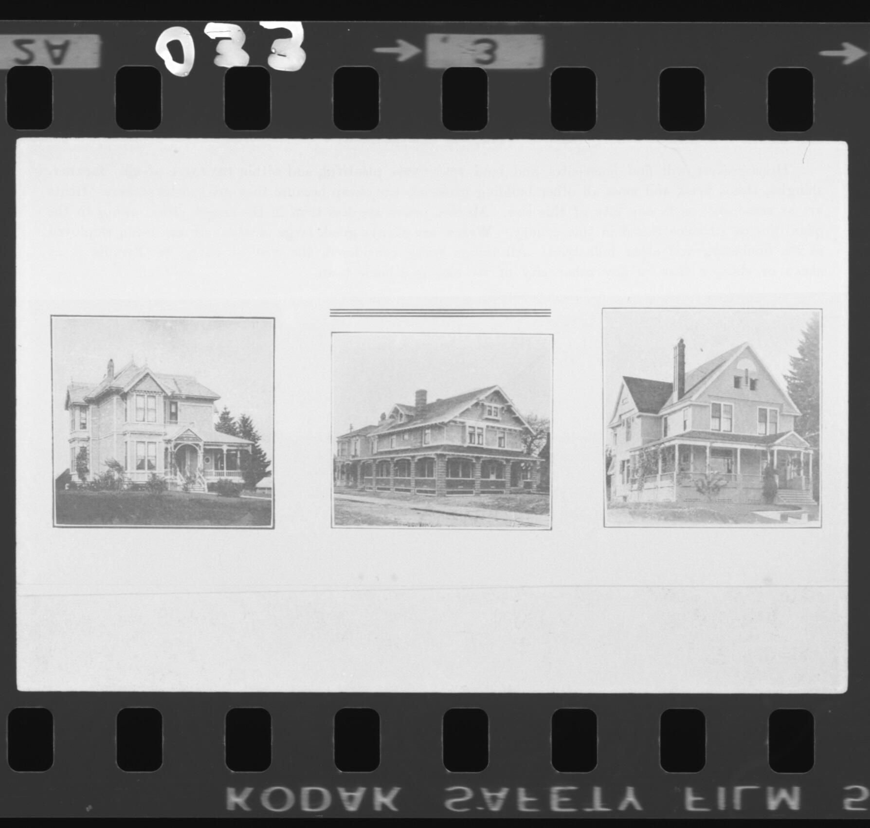 Three historic houses or buildings. Black and white negative probably created from a slide of a photo in "Olympia," a circa 1907 Olympia Chamber of Commerce promotional brochure or booklet. Three separate images with a thin line frame, each featuring a historic house or building.