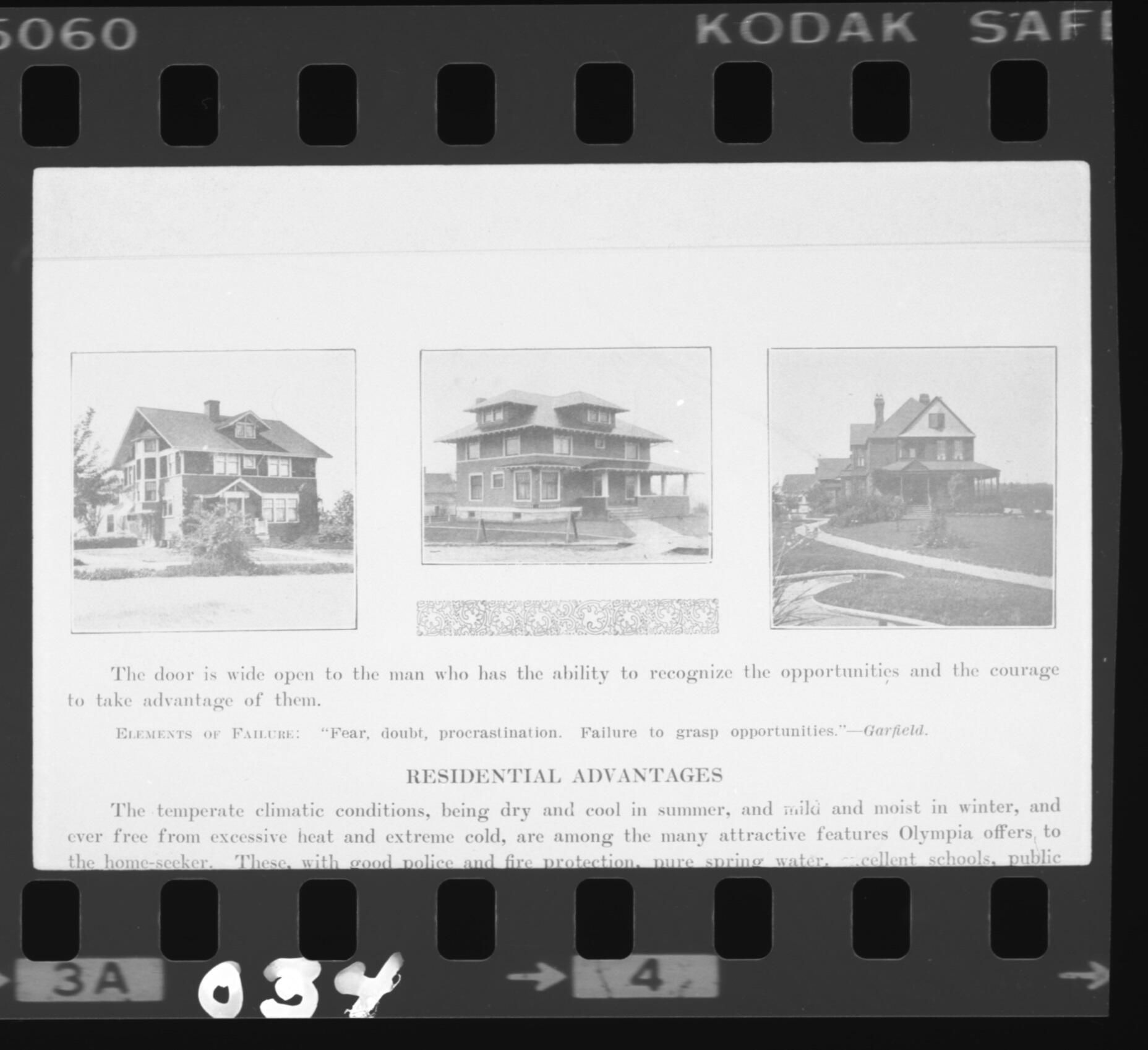 Three houses demonstrate "Residential Advantages" of Olympia. Black and white negative probably created from a slide of a photo in "Olympia," a circa 1907 Olympia Chamber of Commerce promotional brochure or booklet. Three separate images with a thin line frame, each featuring a house. There is a decorative element in a rectangular shape below the middle image.