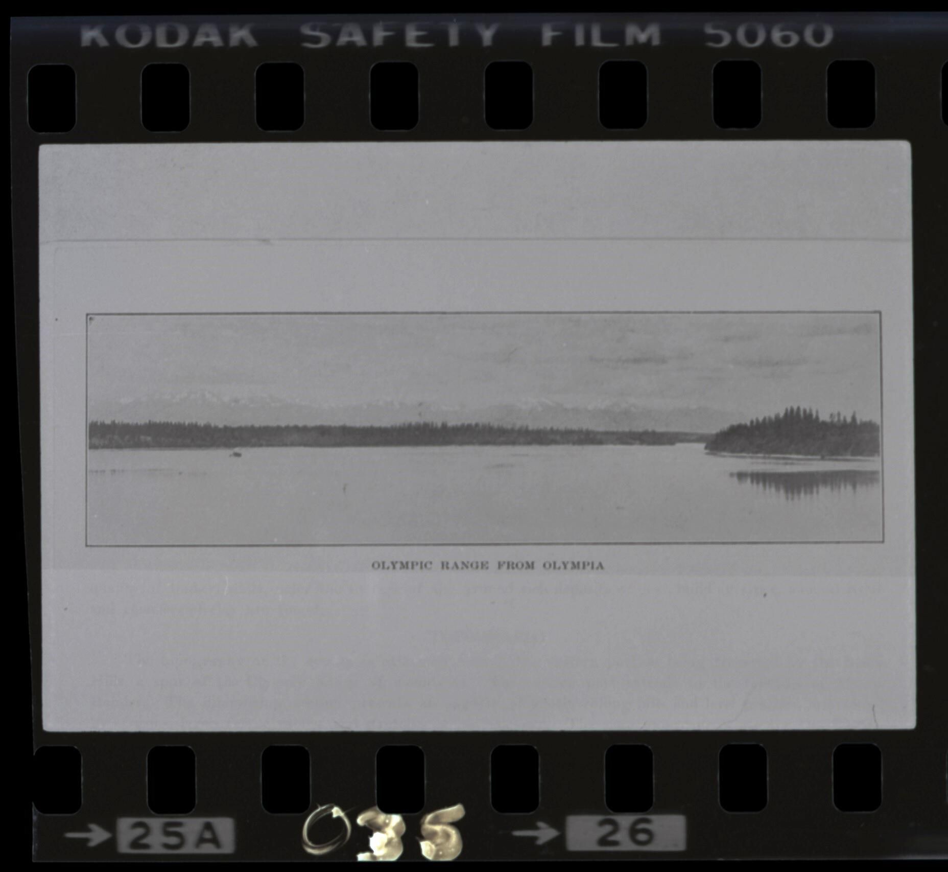 Negative is frame #26, first on a strip of five. Image has the title, "Olympic Range From Olympia." Image is poor quality since it came from a book and it is overly dark. From the viewer's point of view, the frame number "26" is printed at the bottom and printed at the top is "KODAK SAFETY FILM 5060". "035" is written directly on the negative at the bottom.