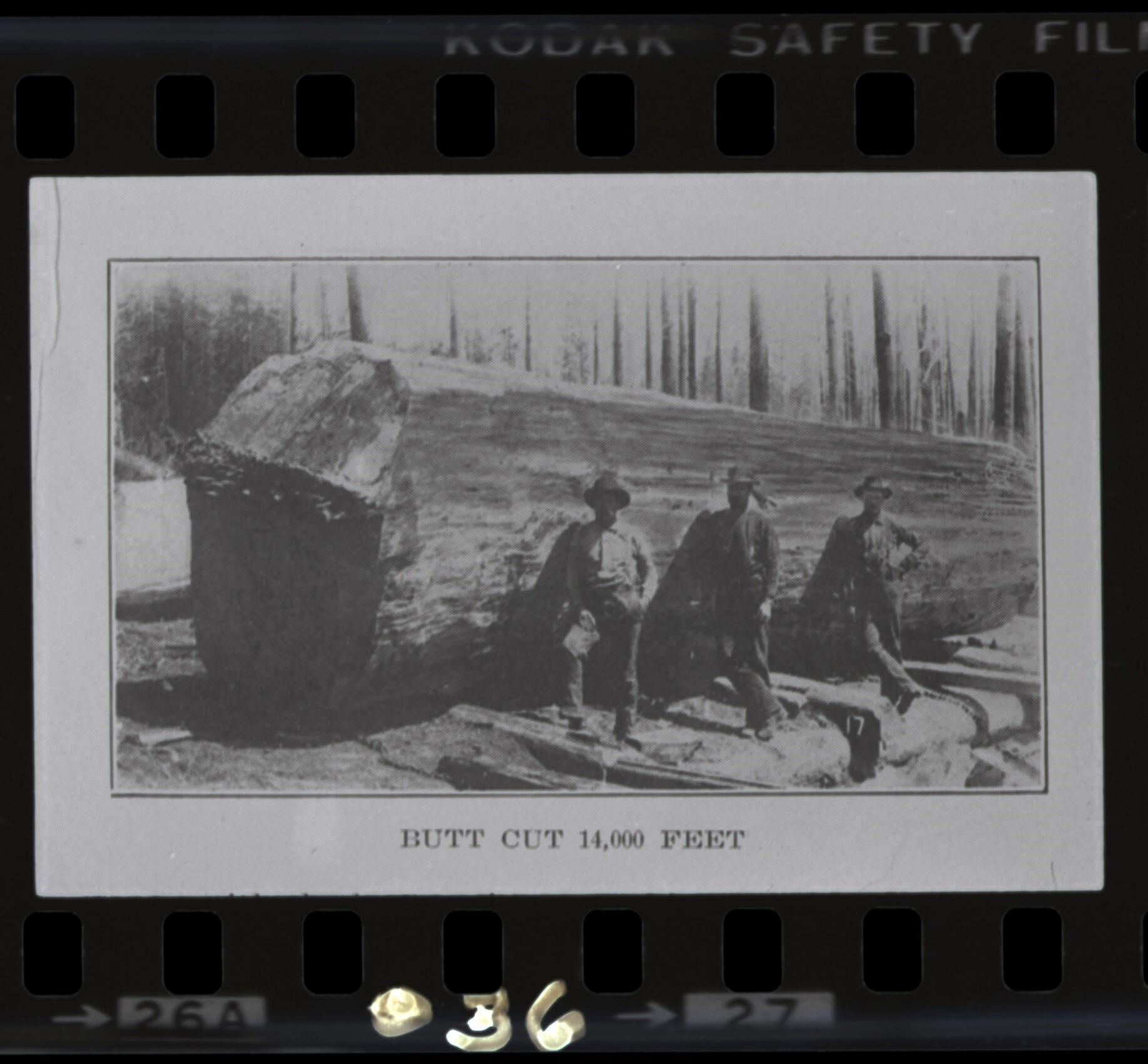 Negative is frame #27, second on a strip of five. Image has the title, "Butt Cut 14,000 Feet." Image is poor quality since it came from a book and it is overly dark. From the viewer's point of view, the frame number "27" is printed at the bottom and printed at the top is "KODAK SAFETY FIL[M 5060]". "036" is written directly on the negative at the bottom.