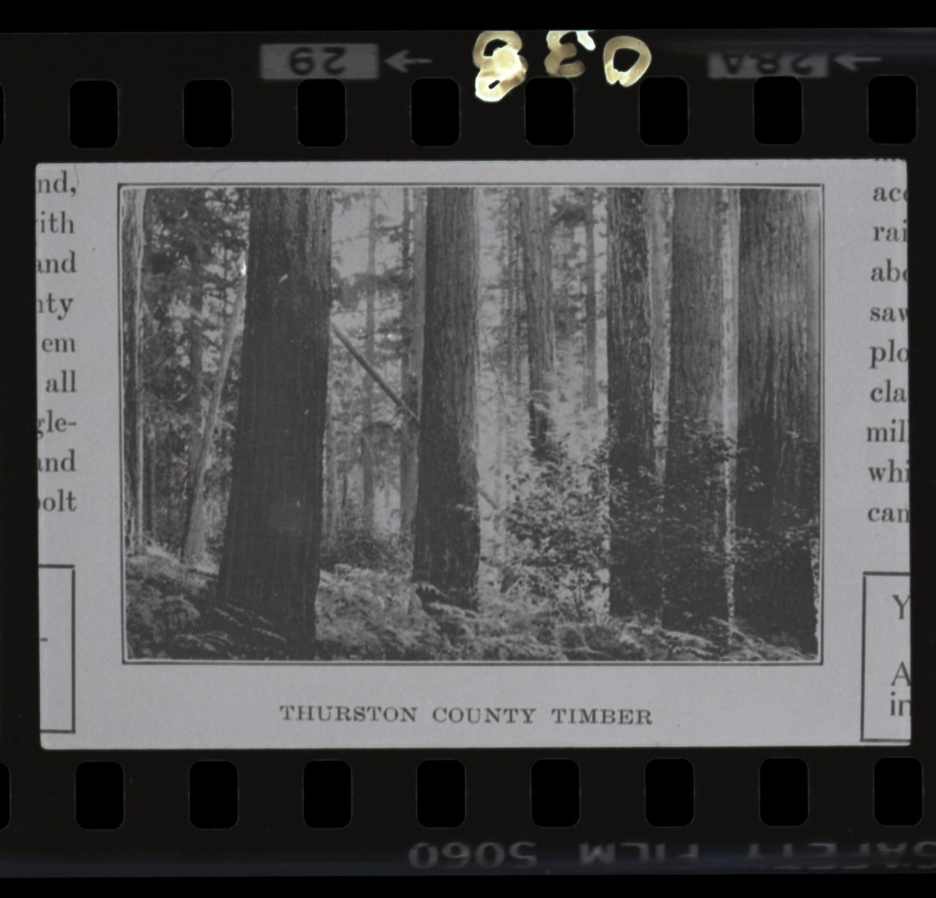 Negative is frame #29, fourth on a strip of five. Image has the title, "Thurston County Timber." Image is poor quality since it came from a book and it is overly dark. From the viewer's point of view, the frame number "29" is printed at the top and printed at the bottom is "[KODAK] SAFETY FILM 5060". "038" is written directly on the negative at the bottom. Image had to be flipped after scanning, so the image is backward on the negative, which also causes the negative marking to appear upside down.