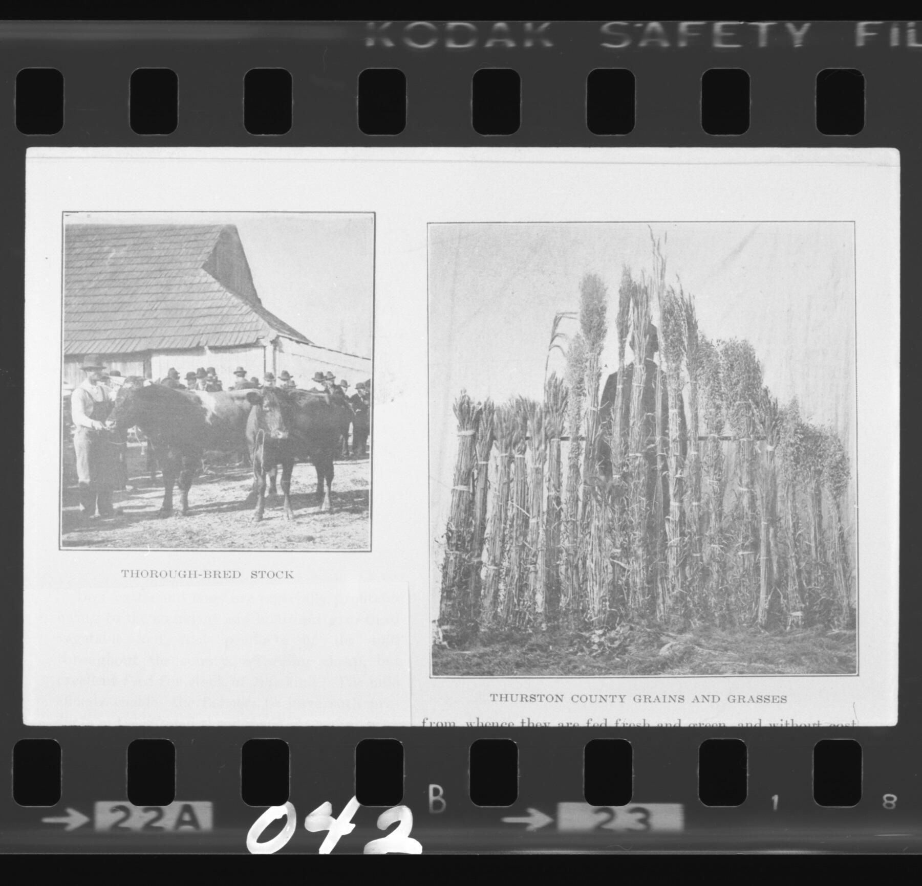 Thorough-Bred Stock and Thurston County Grains and Grasses. Black and white negative probably created from a slide of a photo in "Olympia," a circa 1907 Olympia Chamber of Commerce promotional brochure or booklet. Image at the left includes the titles below the image, "Thorough-Bred Stock" with a thin lines are around it. Pictured are two head of cattle with a man who appears to be their handler. In the background is a crowd of people and what it likely a barn. Image at the right is titled "Thurston County Grains and Grasses" with a thin line around it and the beginning of text below. Pictured is a row of bundled up stalks of grains and grasses. Standing behind them is a man with his back to the photographer. Image is poor quality since it came from a book.