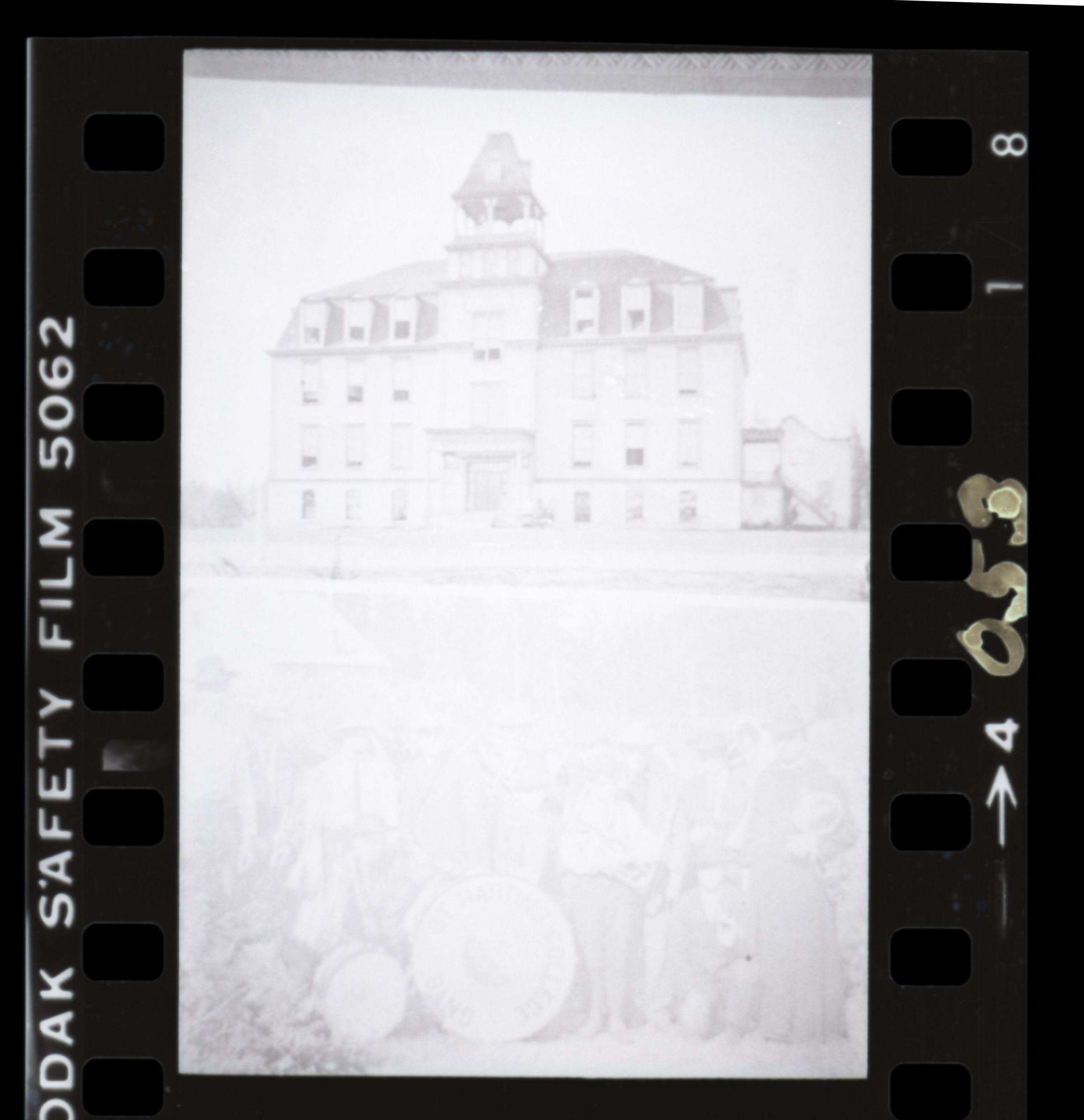 Negative is frame #4, fourth on a strip of four. With the image oriented for the viewer, the frame number "4" is printed at the right (as well as "1" and "8" above that) and printed at the left is "[K]ODAK SAFETY FILM 5062". "053" is handwritten directly onto the right edge of the negative.Made/Created