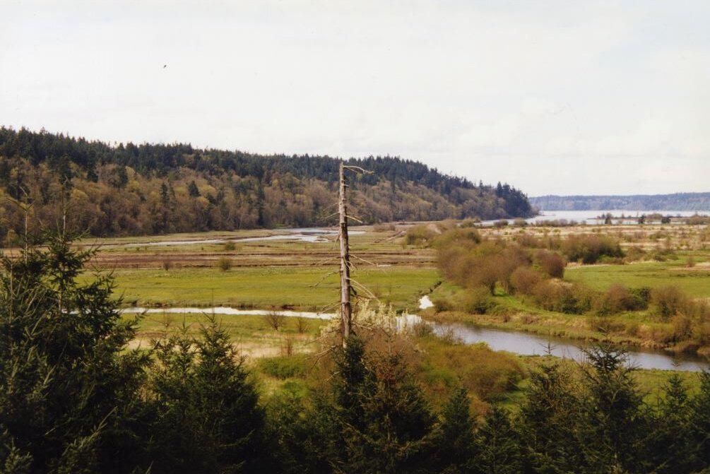Site of the Medicine Creek Council Treaty Tree in Center, 1998. Color photograph is a landscape featuring a view of the Nisqually Wildlife Refuge. The (dead) treaty tree can be seen in the foreground.