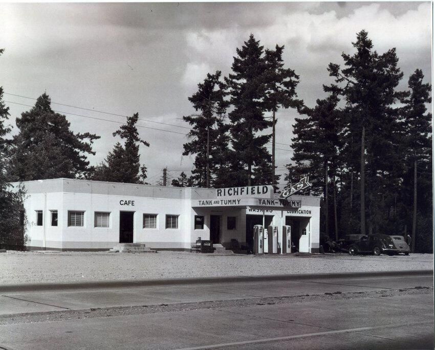 Richfield Tank and Tummy service station and cafe. Black and white photographic print is a copy made from a scan of an original print. Image features a building that has a cafe on the left side and a service station on the right. There is a door at left with the word "Cafe" painted above it and a 3-step concrete entrance. Near the center is a curved rectangular architectural awning with three gas pumps underneath. There is a door under the awning. Around the front edge of the awning is painted "Tank and Tummy" and "Tank - Tummy". On top of the awning is a neon sign "Richfield" and an arrow shaped neon sign: "GAS" extended off the front. There is a large cooler of Coca-Cola next to the door and 3 concrete steps to enter. At the right are two automobile bays, the one on the left has "Washing" painted above and the one on the right has "Lubrication" above. On the right side of the building at least 4 cars are parked and a person is standing at the far right of cars. Behind and to the right of the building is an area forested with pine trees. In the foreground is Martin Way. According to the donor, this cafe used to be across the street from where River Ridge High School is, the current site of a strip mall.