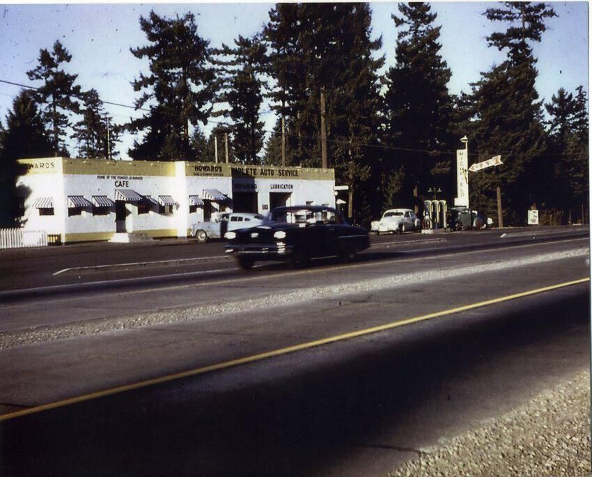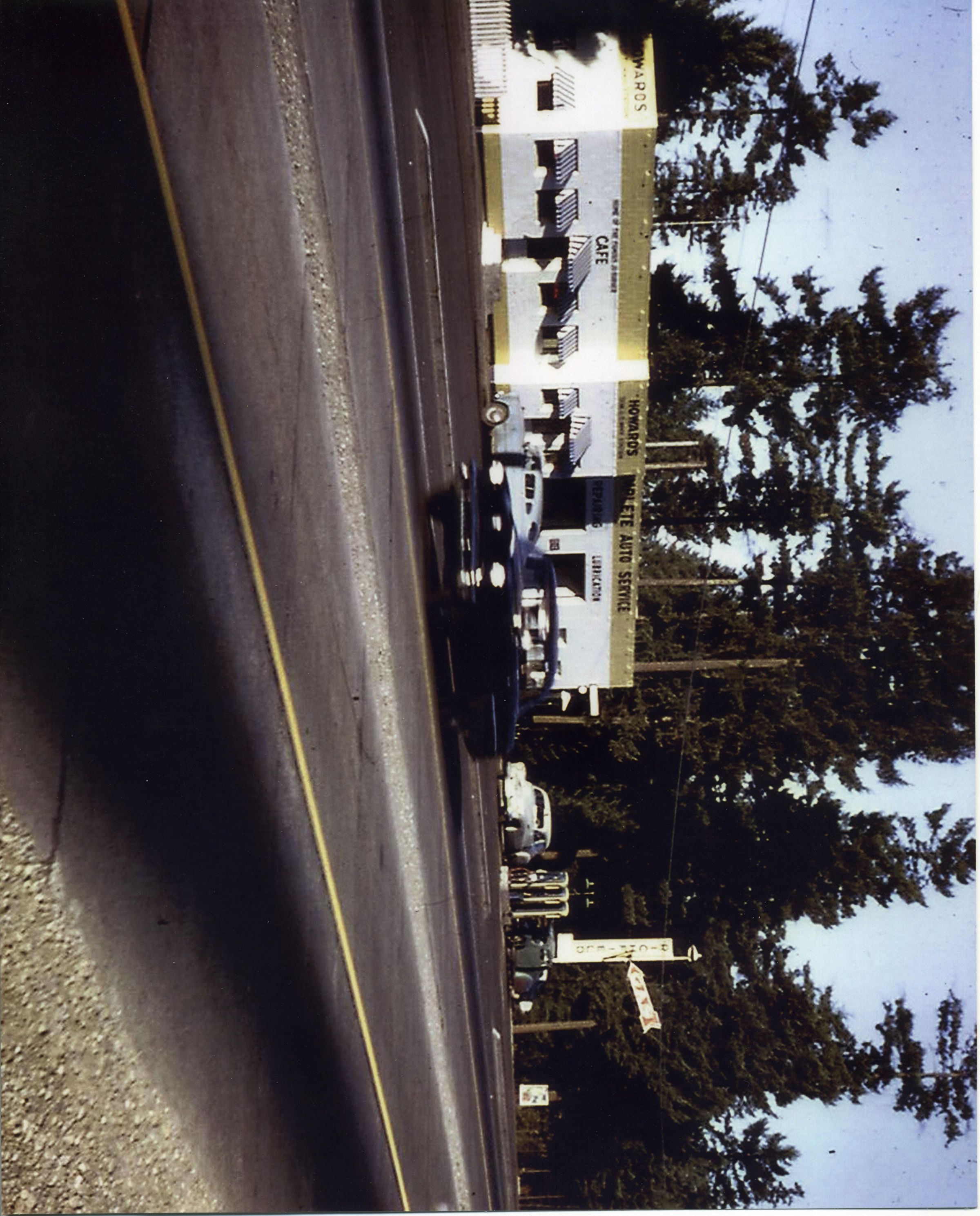Howard's Tank and Tummy Station. Color photographic print is a copy made from a scan of an original print. Image features a probably concrete building that has a cafe on the left side and a service station on the right. There is a door at left with the word "Cafe" painted above it and "Home of the Famous Jo Burger" above that and a 3-step concrete entrance. Near the center of the building is another door. Both doors have striped awnings over them. There are five windows on the front and one on the side each with striped awnings over them. Above the center door is painted "Howard's Tank and Tummy Station". "Howard's" is also painted on the left side of the building. A white picket fence extends left from the building. At the right of the building are two automobile bays; over the left is painted "Repairing" and over the right is "Lubrication" and over both is "Complete Auto Service." At the far right of the building is a door and window which is obscured by a dark colored car driving past. There appears to be a sign hanging off the far right end of the building, but the sign is not readable. There is a light blue car parked out front that appears to be an early 1950s style of car. There are two cars parked at the gas pumps at the far right of the photo. There appear to be 3 gas pumps, a tall vertical sign and a sign "GAS" extending out from it, probably neon. There is a smaller sign and a fence on the right. In the background is a forested area and in the foreground is Martin Way.