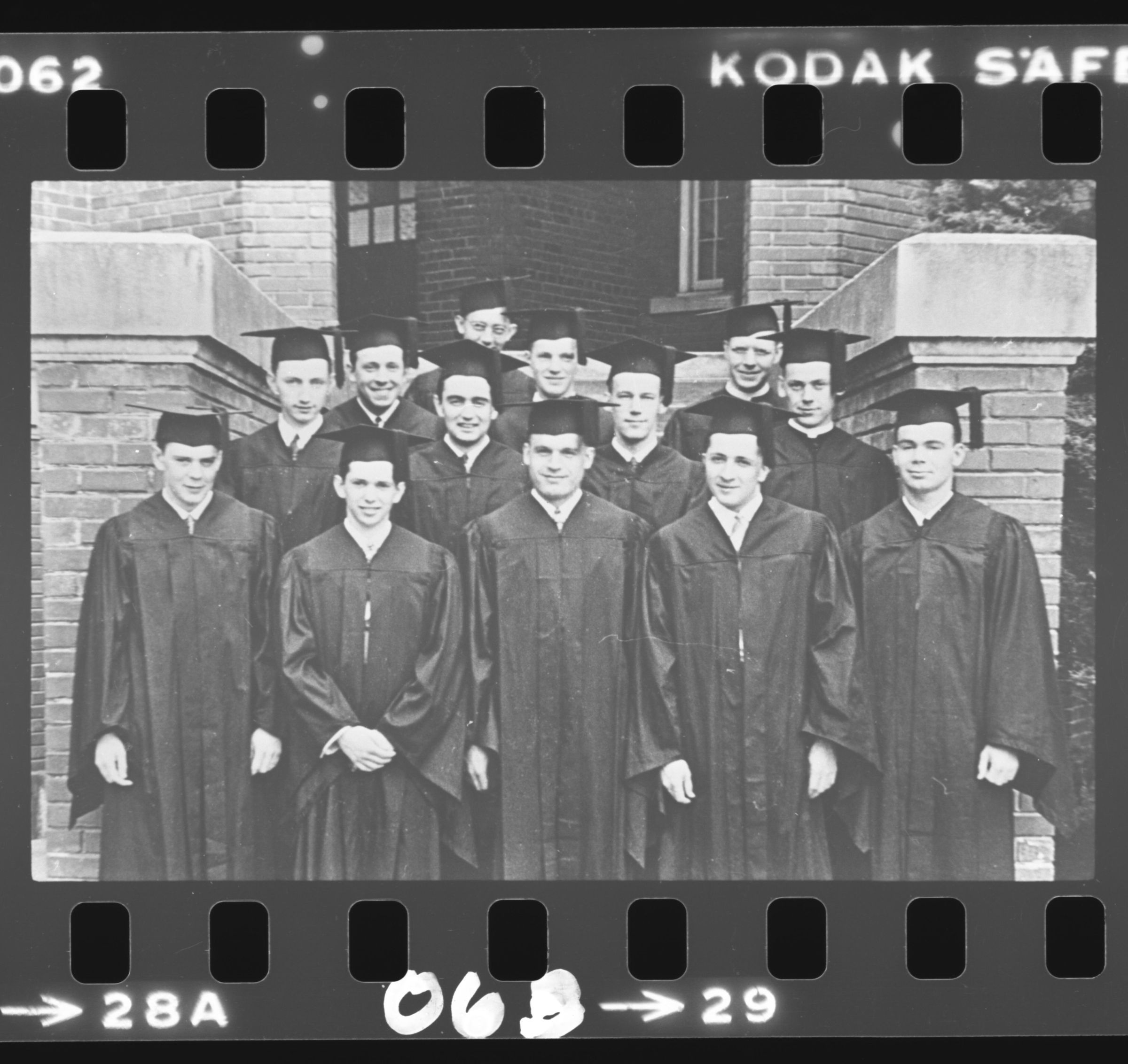 Negative is frame #29, second on a strip of five. With the image oriented for the viewer, the frame number "29" is printed at the bottom and at left "28A" and printed at the top is "KODAK SAF[ETY FILM 5]062". "063" is handwritten directly onto the bottom edge of the negative.Made/Created