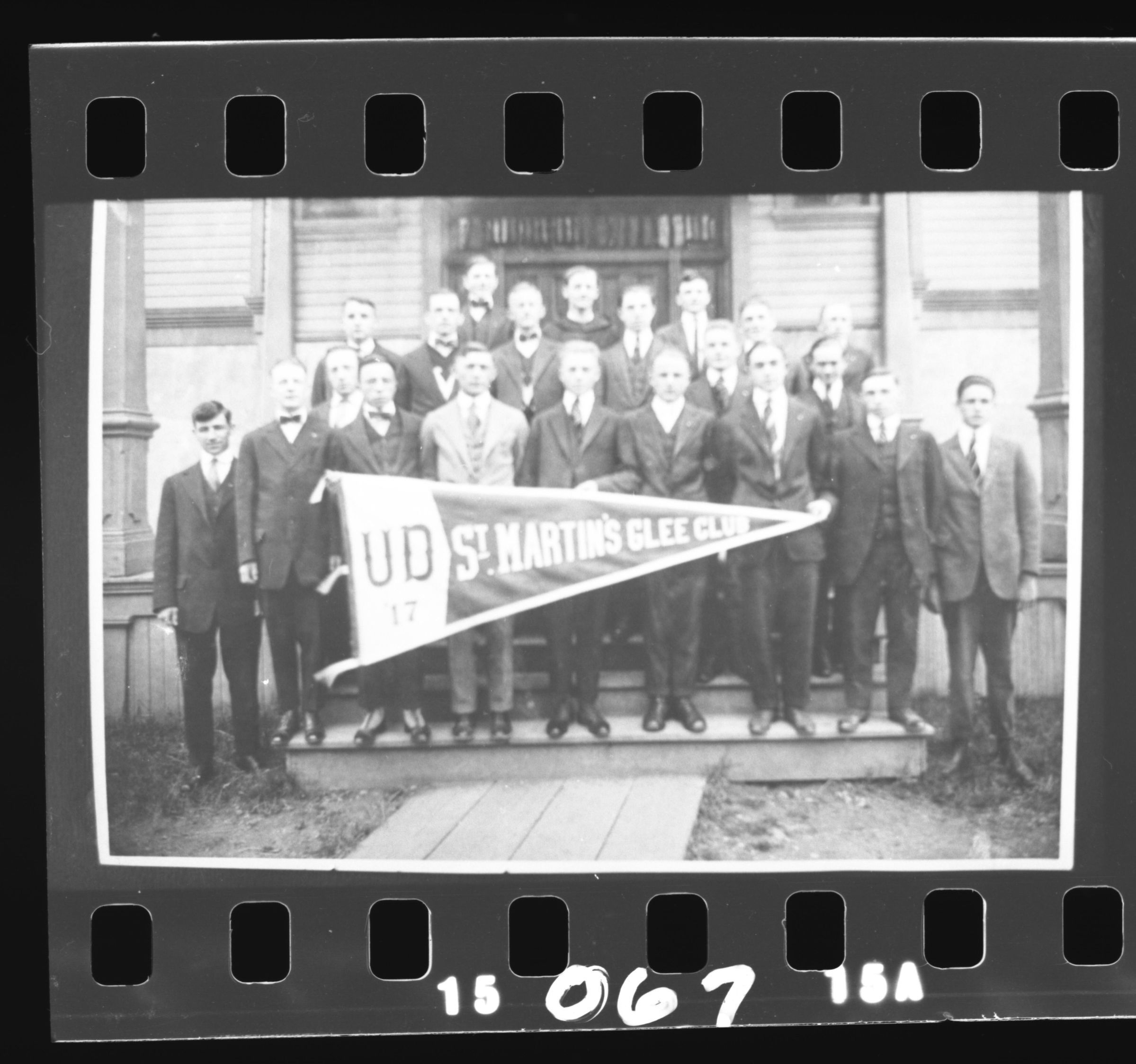 Saint Martin's Glee Club, 1917. Black and white negative. Image features 21 men in mostly dark suits. The man in the back row center appears to be a monk, judging by his robe. Two of the men are holding a giant triangular pennant that stretches across five men in the front row. It reads "U D 17" and "St. Martin's Glee Club." Presumably, the "17" is short for the year 1917, which is consistent with the clothing. They are standing on the steps of a wooden frame building with columns on either side.