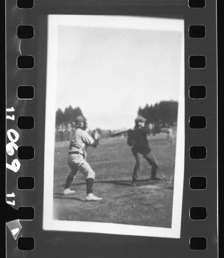 Saint Martin's Baseball team members playing ball, c. 1910s. Black and white negative, probably made from a print. Image features a batter and a catcher playing ball. The batter appears to be in street clothes with slacks and a casual jacket and hat. The catcher is in uniform with a baseball hat, catcher's mask, catcher's glove, long socks and light colored shoes. Tall trees can be seen in the background. In the distance, another uniformed player can be seen. Picture is a snapshot and is somewhat blurry.