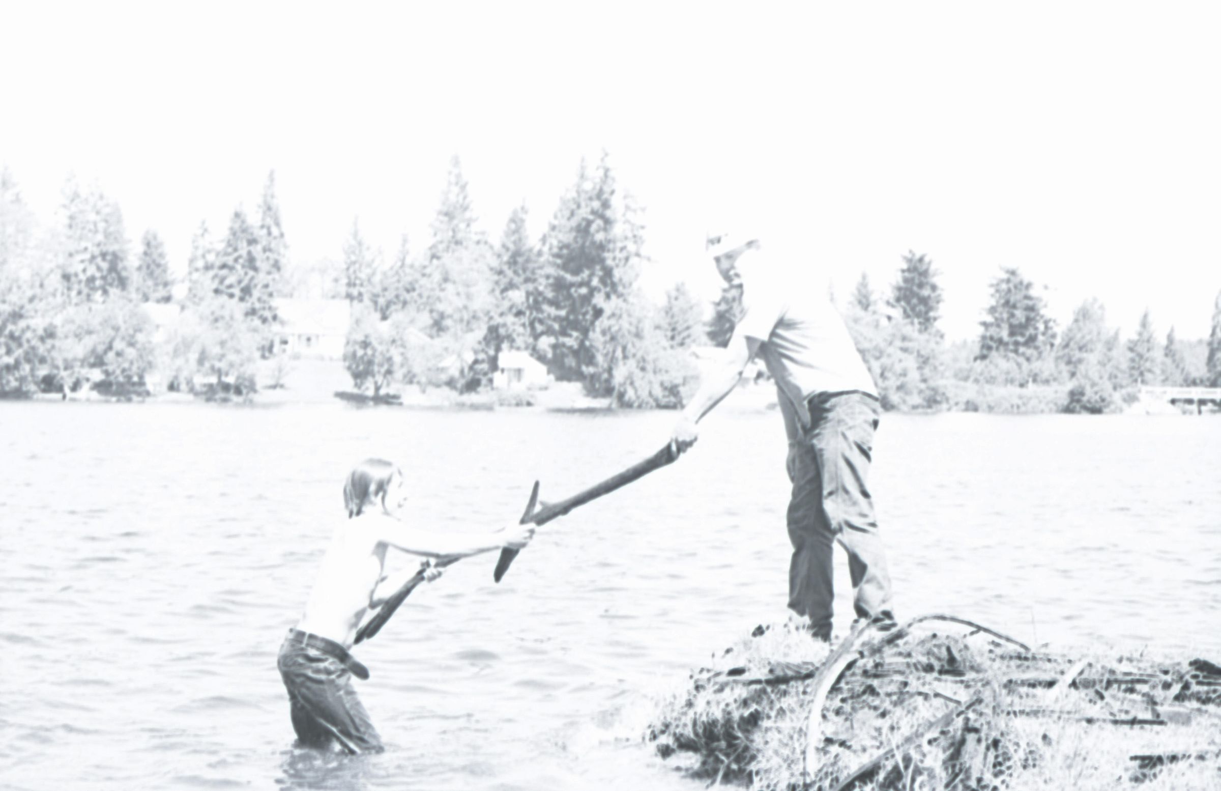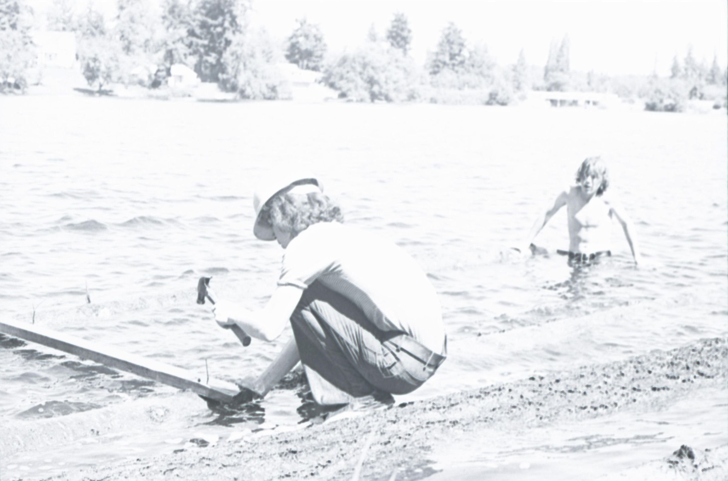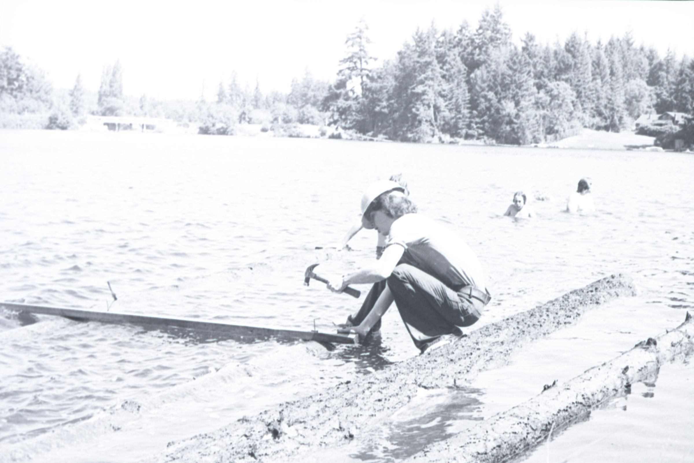 These images show at least four different people pulling debris from the water, hammering boards and cleaning up the lake. According to the negative sleeve, these images were taken on June 19, 1974.