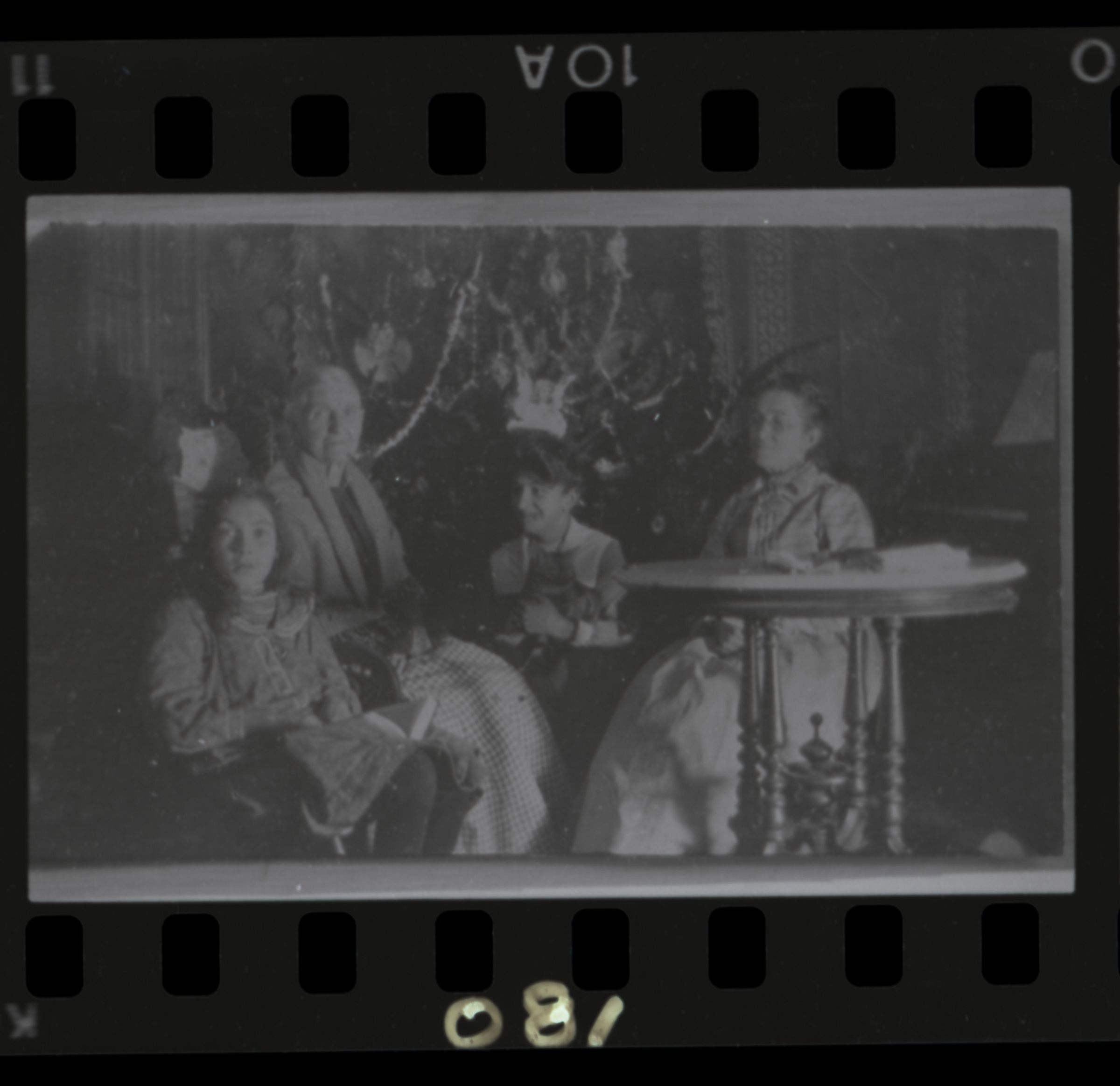 Louise Shaw, Rose Smith, Henrietta Robarts and Emma Neihaus, possibly c. 1890s. The women are seated in what appears to be a parlor, with a table at right and a Christmas tree behind them. There is a piano at far right. Rose appears to be in a rocking chair. The edges of the original photograph are visible with the wood frame of the copy stand behind. It's possible that this is the interior of the Smith home on the Hawk DLC.
