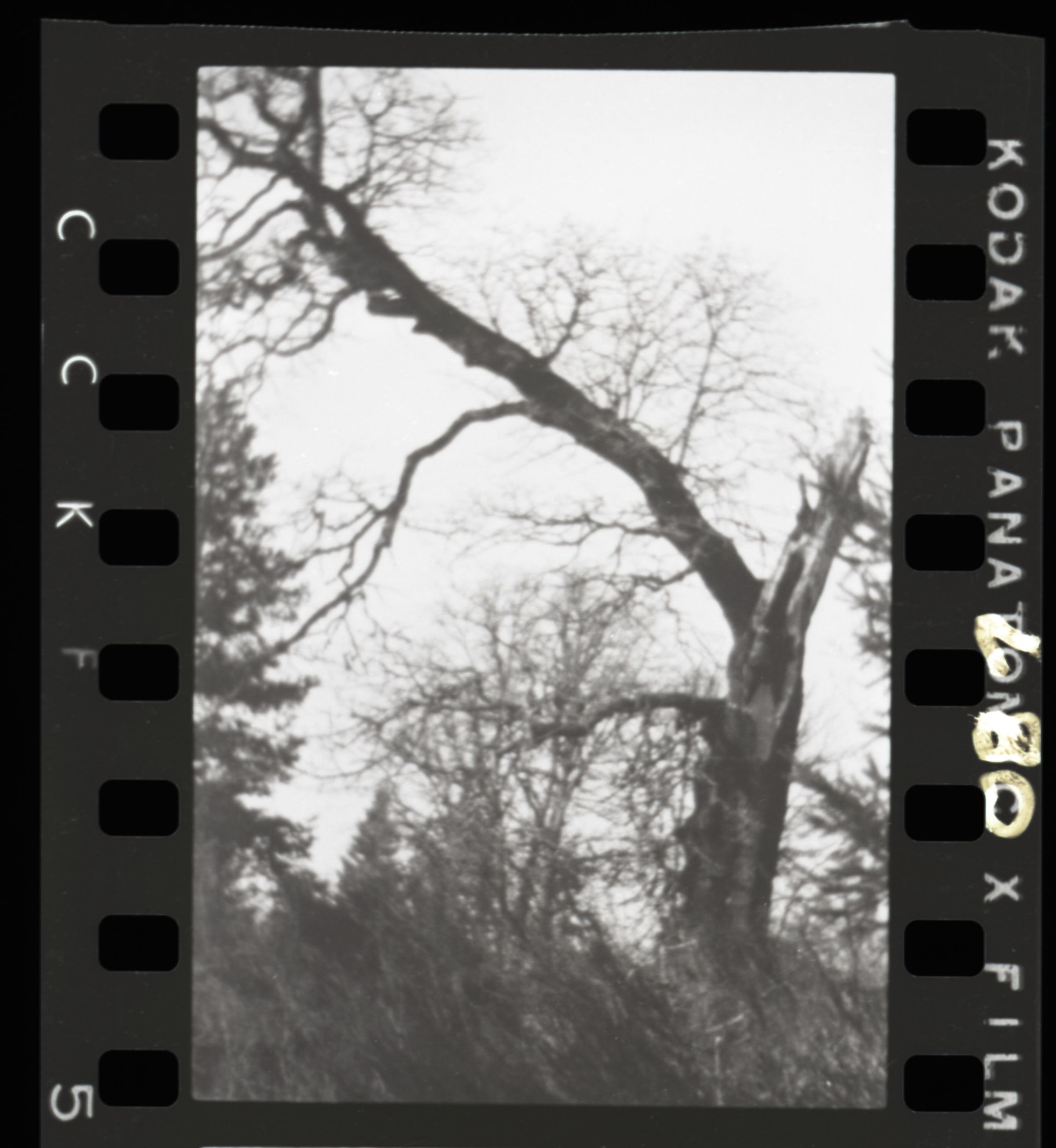 Negative is frame number C C K F, fifth on a strip of five. The frame number "C C K F" is printed at the left center, and "5" at the bottom left. "087" is handwritten directly onto the right edge of the negative and obscures the printing: 'Kodak Panatomic X Film." On another part of the strip is printed: "Kodak Safety Film."Made/Created