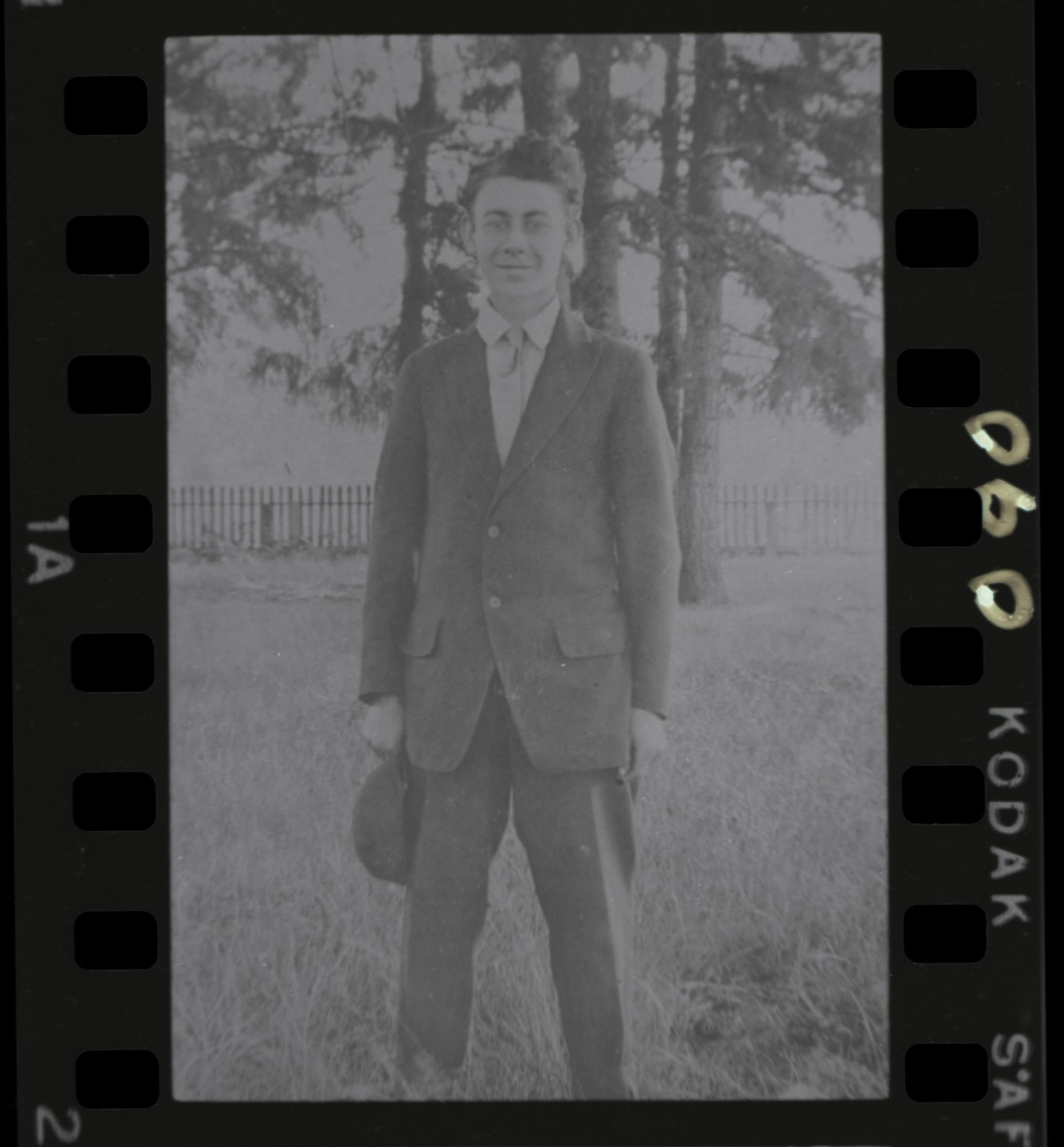 An unidentified man, possibly Harold G. Bowker. He appears to be about 16 years old and is wearing a suit: long pants, a buttoned-up jacket, light-colored shirt, light colored necktie and he is holding a hat. He is standing in a field with several tall pine trees and a fence behind him. This is the same background as N083-1.