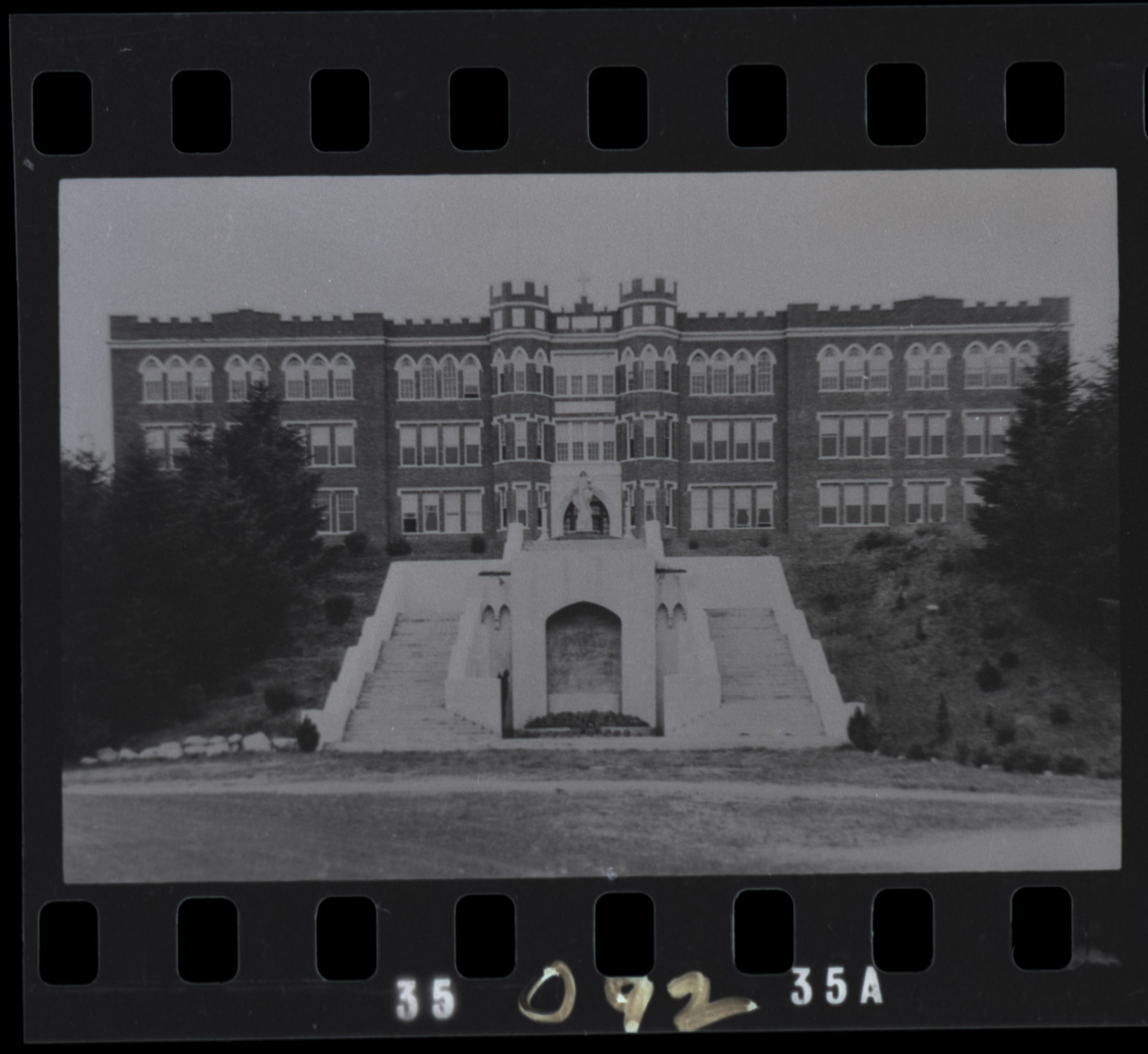 Old Main, Saint Martin's College. Black and white negative, probably created from a photograph. Pictured is a view of the second Old Main at Saint Martin's College as viewed from the south (Pacific Avenue side). What appears to be a gravel road exits to the left and the right of the image. There is a grand double staircase around an arch in the center, which is topped with a sculpture.