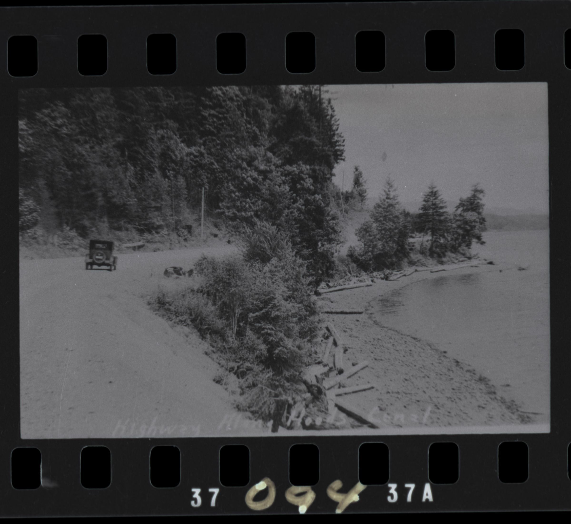 Highway along Hood Canal, c. 1937. Black and white negative, created from a 3 x 5 postcard. Pictured is a scenic view of the shoreline and a car driving away in the distance. There is a steep tree-covered hill to the left of the road and to the right there are shrubs, driftwood, beach and water. Written at the bottom is: "Highway Along Hoods Canal."