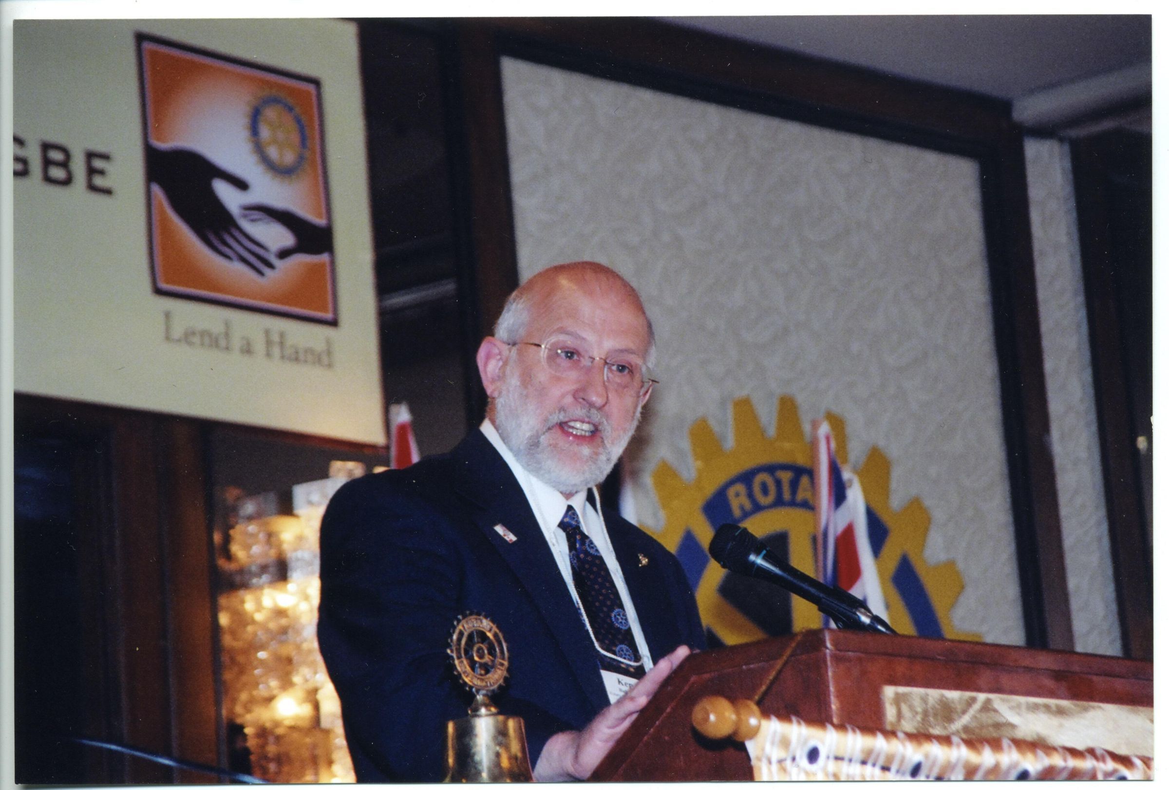 Ken Balsley at Presidential Rotary conference. Digital copy of color photograph. Ken Balsley is speaking at the 2003 Presidential Rotary conference in Vancouver, British Columbia. He is standing at a podium with a microphone in front of him. He is wearing a dark suit, light colored shirt, and glasses and is about 61 years old. Behind him on the wall is the Rotary logo. Beside him is a Rotary bell. Behind him appears to be a Rotary banner which includes an image of two hands reaching for each other, the Rotary logo and the phrase "Lend a Hand."
