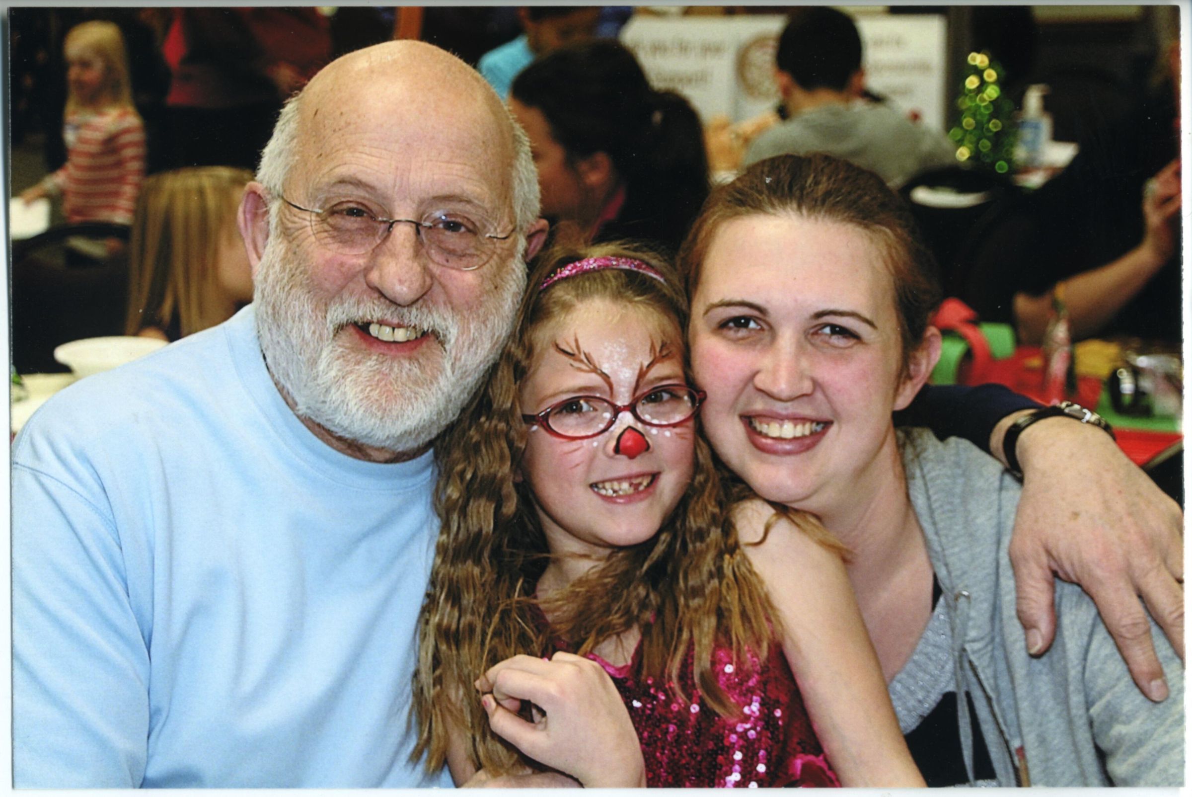Ken Balsley with his niece Katie Balsley and Katie's daughter Lexie at the teddy bear tea party sponsored by Capital Rotary Club. Ken is wearing a light blue t-shirt and glasses, He has a beard and is about 71 in the photo. Lexie is wearing a red sequin dress and has glasses on. Her face is painted like a reindeer. Katie Balsley is wearing a grey cardigan and Ken's arm is around her shoulder. In the background you can see unidentified people, a crafts table, and a small table top Christmas tree.