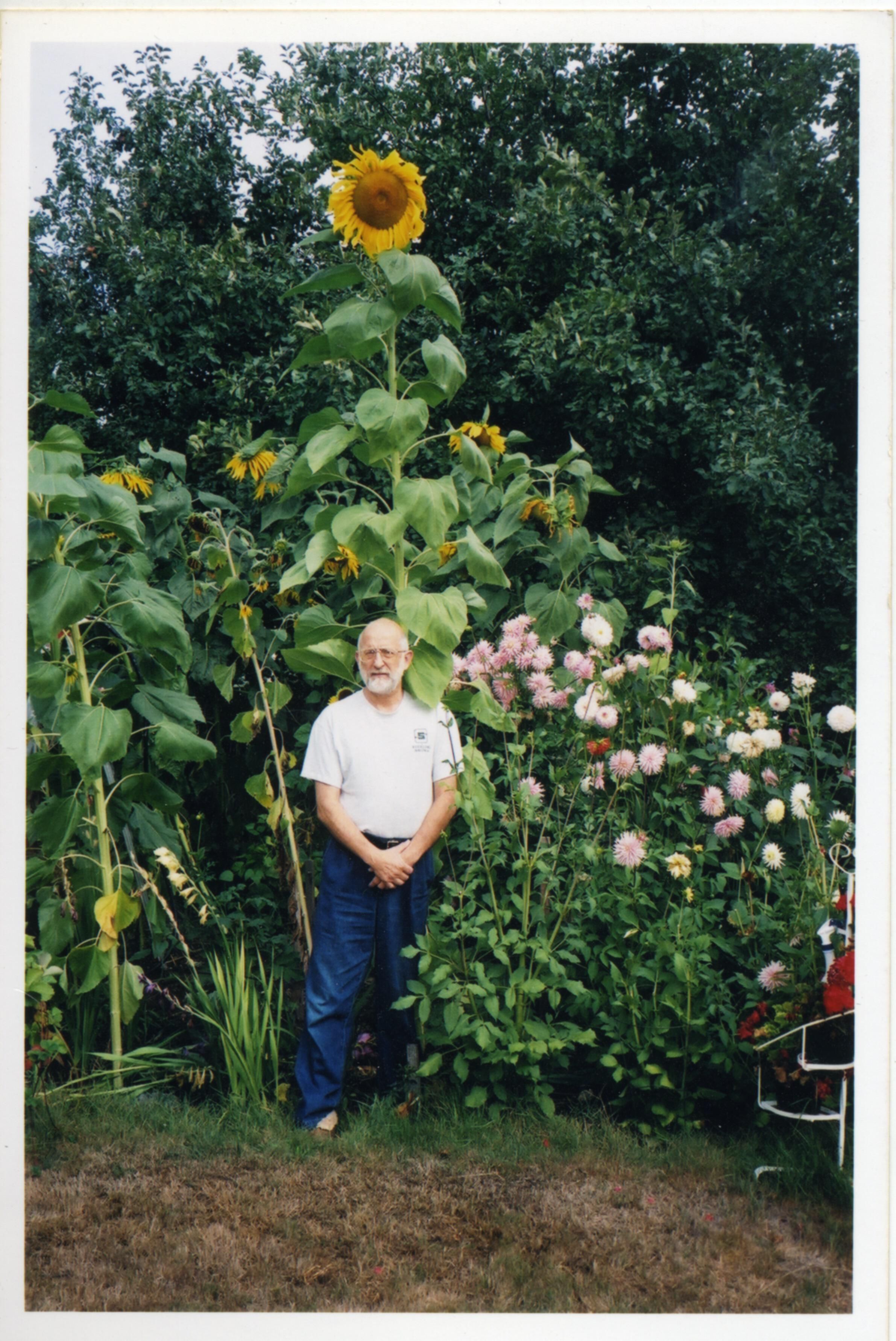 Ken Balsley is standing in his garden in the early 1990s. He is wearing glasses, jeans and a white t-shirt. Behind him is the garden, which includes very tall sunflowers and next to him are other flowers which are pink and white. Digital copy of color photograph.Made/Created