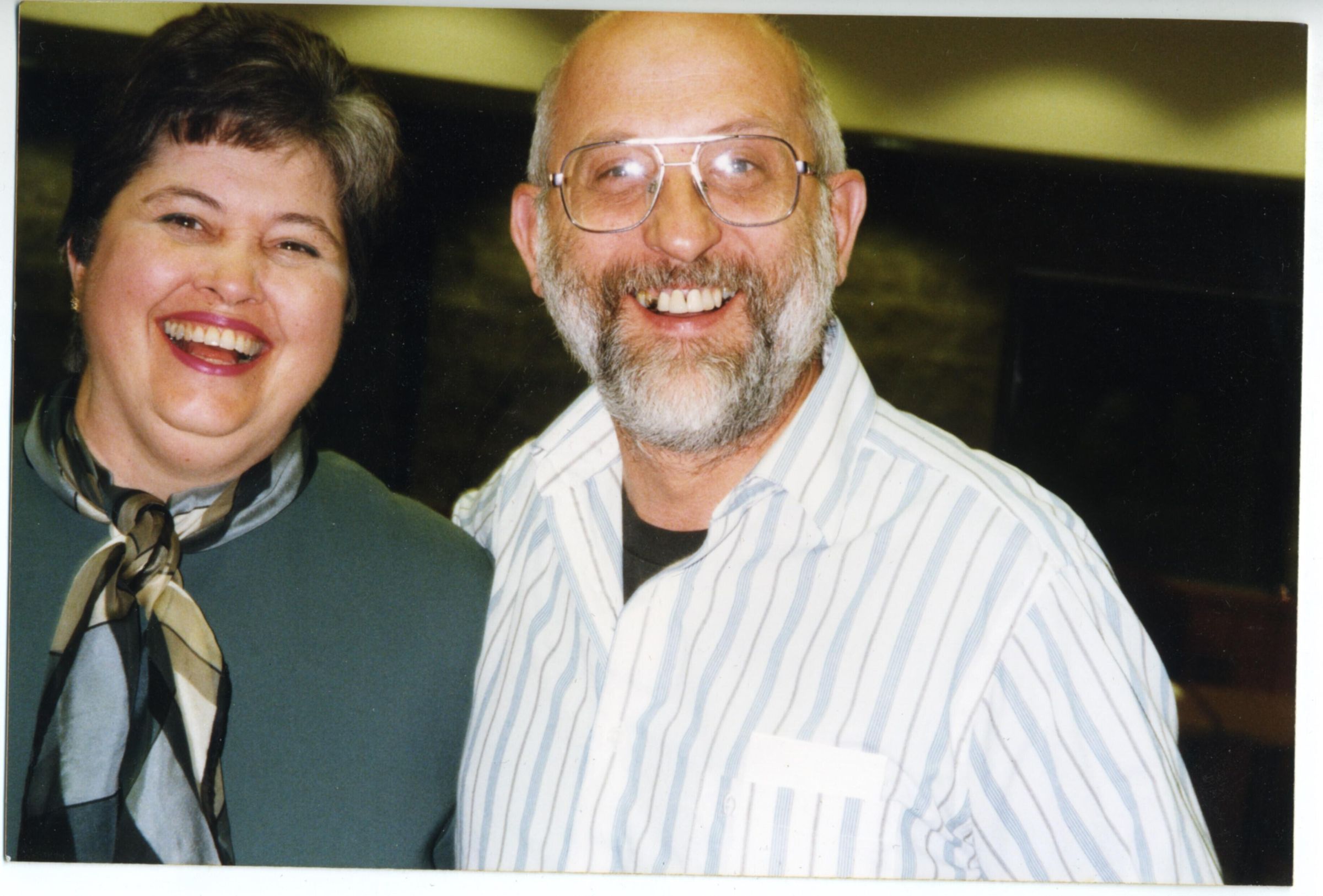 In this photo Ann Burgman is standing to the right of Ken Balsley. Ann Burgman was a city council member, deputy mayor and Ken was her unofficial campaign advisor. Ann is wearing a teal top with a blue, teal, tan, and white scarf around her neck. Ken is wearing glasses, a white striped button-up shirt and a black shirt underneath that. He is about 54 years old in the photograph. Digital copy of a color photograph.Made/Created